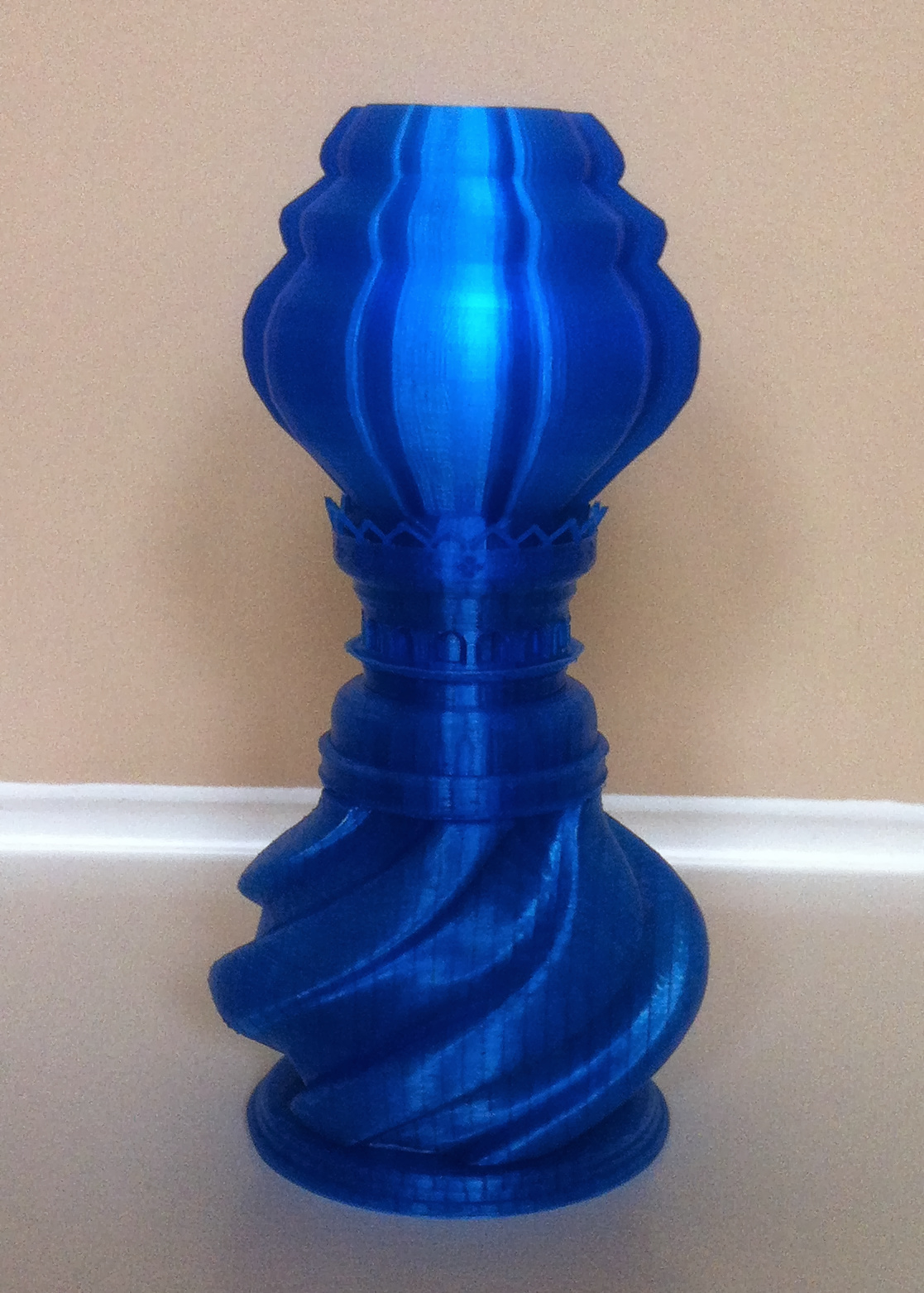 I used my Ordbot with blue 1.75 PLA. The Ordbot has a .35 nozzle. The base, the castle bit and the tea light holder were all sliced with .15 infill using a honeycomb fill pattern. The shade is a solid model which I printed with no infill and no top and bottom. The large swirly bit had a .1 infill with a rectilinear fill pattern. Temps for this PLA were 215 first layer and then 210 after and for the bed 55.