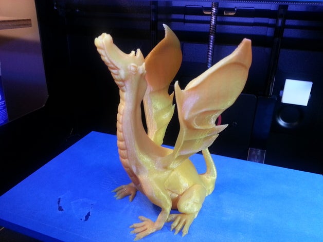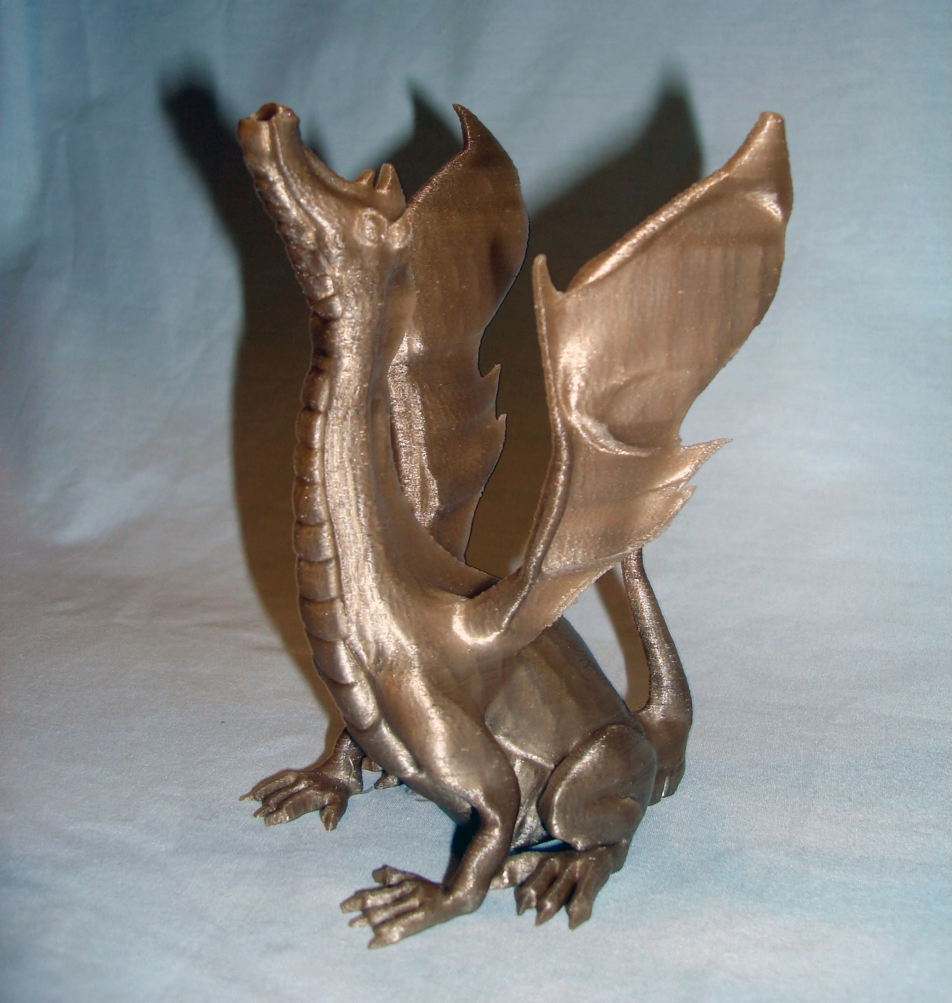 I have designed a dragon which prints without supports or need for assembly. Took a while to get the design right and battle with overhang as I didn’t want compromise shapes too much. Aggressive cooling required. The printer used is my Ordbot and the filament a gold 1.75 PLA printed on a heated bed using hairspray as a fixative.
