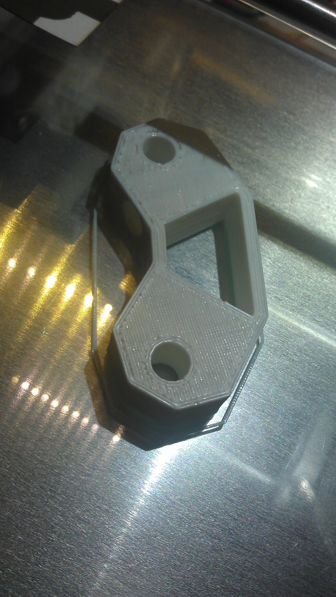 I have finished my build of a RepRapPro Mendel and done my first print. After a few unsuccessfully attempts I realised that I had cleaned the bed with acetone with oil. After cleaning it with an LCD cleaner thing worked much better. From looking at the part I’ve printed I think an increase in the extruder speed is needed. The top layer has some gaps in it. That will be my next step to try. Feels like a just banged it together so I’m really amazed at the quality. I tried to print a much smaller thing but that did not work that well so a guess there is some outer things to consider when printing small things. Comments and suggestions are welcome. So much to learn.