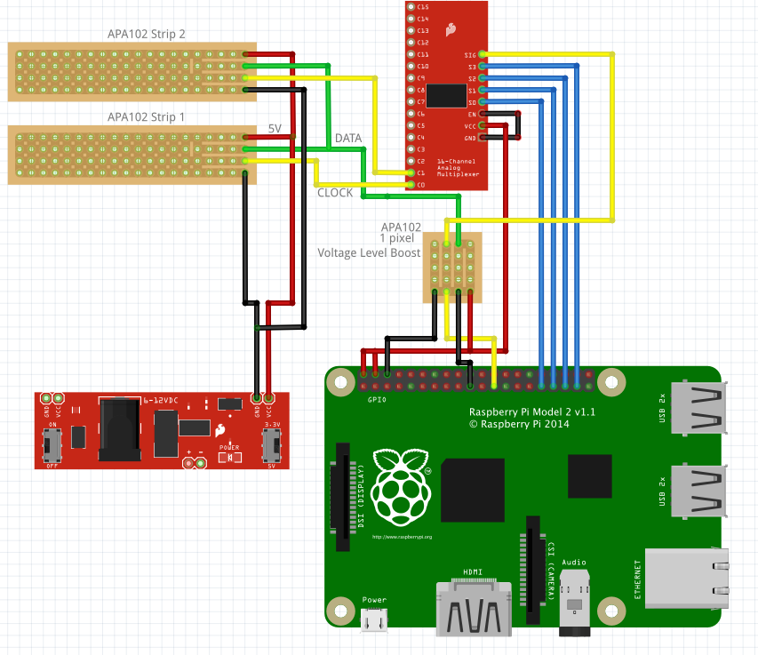 I have further tested the HC4067 16 Channel Multiplexer to drive multiple APA102 strips. I have successfully driven 2 strips of 12 pixels at 20Mhz using an Rpi A+. This $4 chip can help add redundancy to large projects, and lets you drive APA102 at higher speeds when you have more then 500 pixels(on strips). You can chop up a huge layout of, for example 2000 pixels into blocks of 200, and drive them at speeds higher than you would be able to drive 2000 pixels in a long chain. Example code here https://github.com/leonyuhanov/rpi_apa102driver and little video here of it working https://www.instagram.com/p/BEh_8g4RDVP/