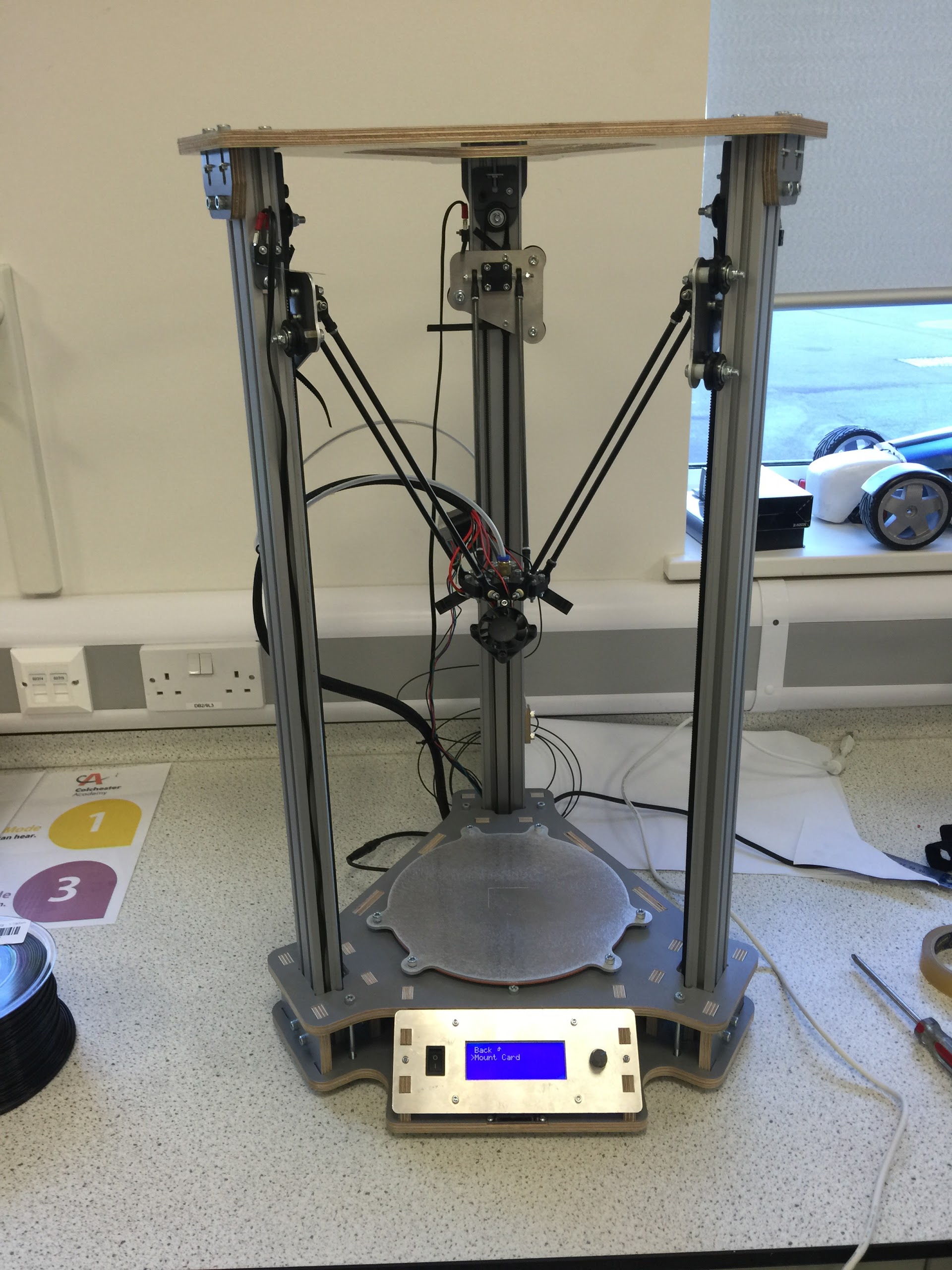 Arms are carbon, and seems strong, it is called a deltic, I believe it was an open source design but changed to suit the designers need. It runs an andrino board. And manufactured in the UK.