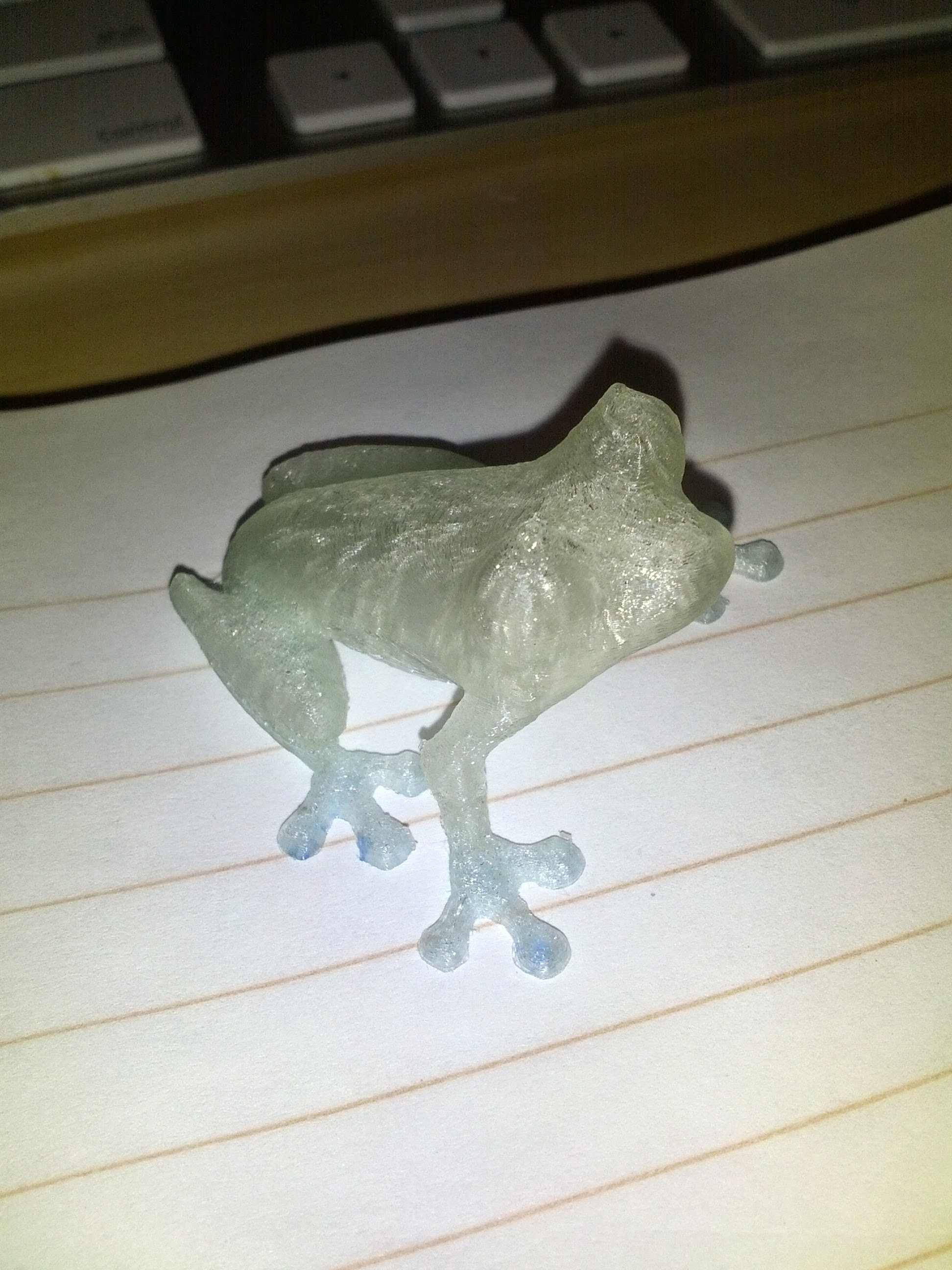 I have two rolls of PLA one blue and one clear. I kept having issues with a print failing after a few layers. tried lowering temp a few degrees, then going higher. ended up printing this at 250c according to the temp on the rep2x. The nozzle clogged however about 20 layers up, but i caught it kind of quick, cleared it and resumed, this was the result.