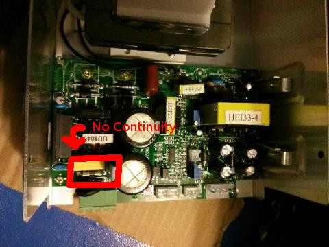 I opened the power supply case up to have a look inside. I see what looks to be a fuse soldered directly on board (there is a silkscreen piece of text next to it that says ‘FU2’). I checked the continuity across it and there was none. None of the capacitors looks to be damaged: I don’t see them ‘bowed’ and no magic smoke came out that I could see.