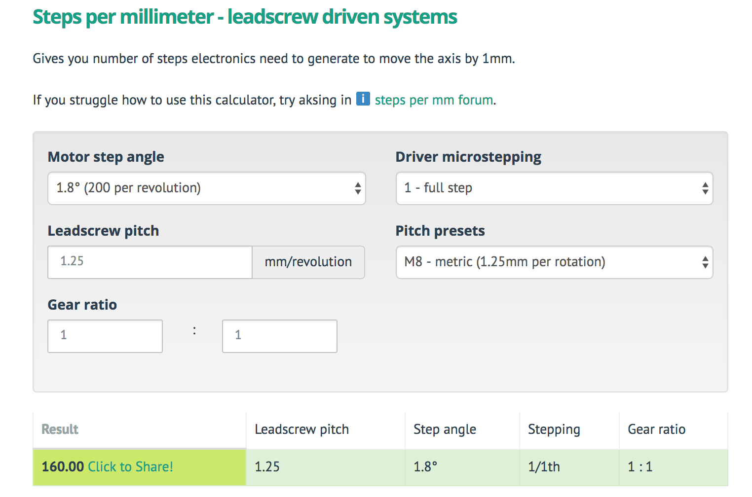 Please update wiki to say 25 steps, or not use the website linked… There is a mistake on the website , if it says 160 steps/mm for 1 step config…