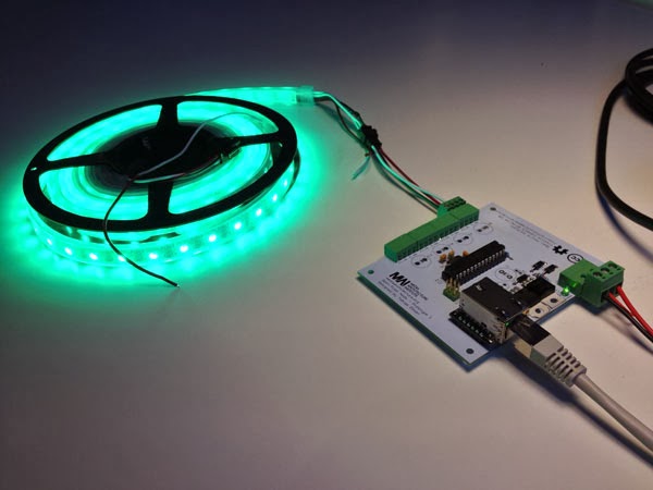 Yes, it’s basically an Arduino with a built-in Ethernet shield (but with the faster W5200 Ethernet chip). It also has power input for the LED strings routed to each of the four outputs. All the green connectors are plug-in terminals.