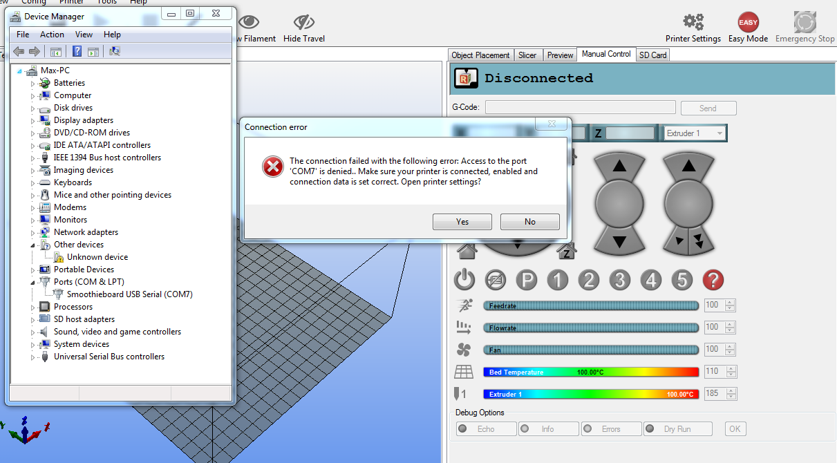 I just upgraded my printer to a Azteeg x5 mini and I cant seem to get it to connect to my computer. I have installed the drivers and it looks to be fine in the device manager under COM7. But in when I try and connect I get this error. Has anyone else had this problem before