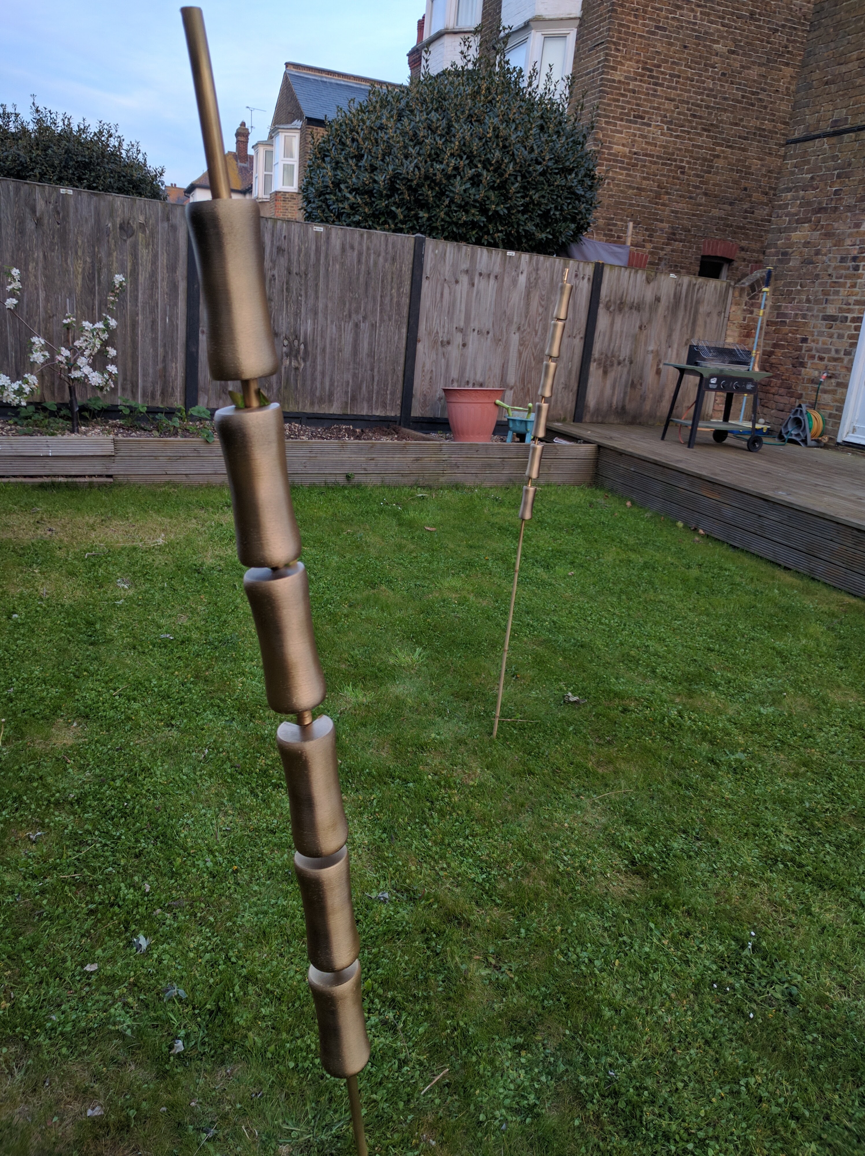 Then it needed to be sprayed gold and, perversely, the best way I could think of holding the pieces such that I could get to all their important little places was to tape them to bamboo poles and stake them in the lawn