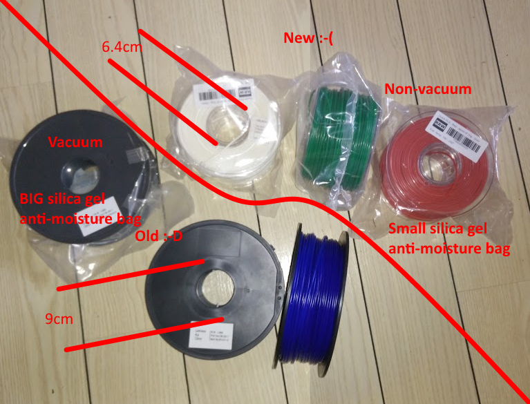 the silica gel pads are in both old & new but the new(bad one) the silica gel bag is smaller and has no vacuum so i don’t think that that is the same quality since I payed with the idea that would get the old spools since they didn’t say any where that the spools where different.