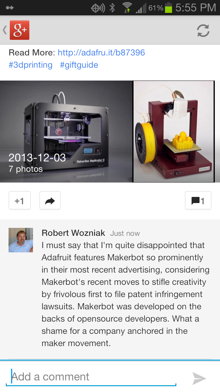 I don’t know what’s more offensive about Adafruit: aligning with MakerBot or censoring users criticism. I really am boycotting them and their products art this point.