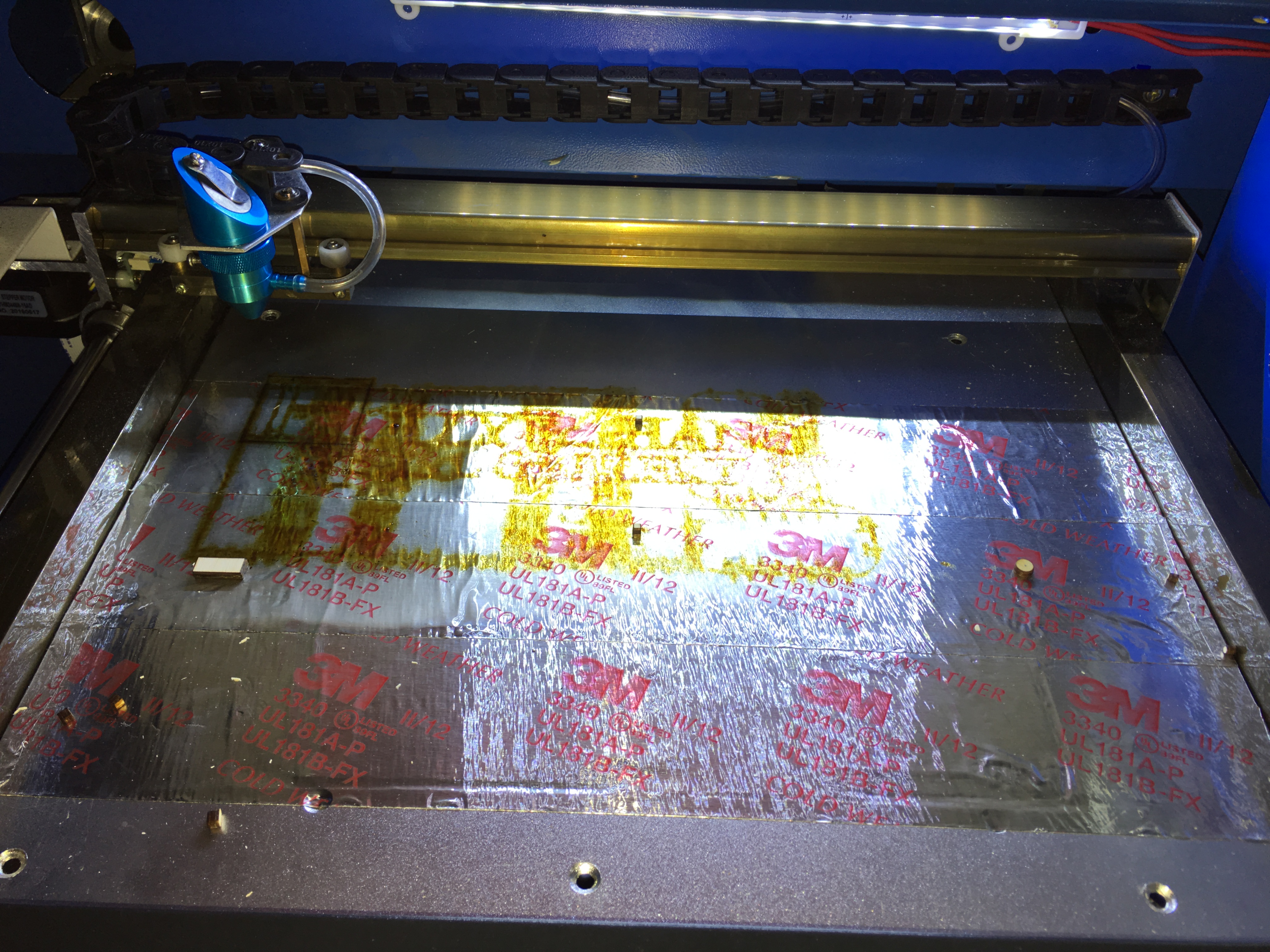 I removed the original bed and removed the lousy clamp. Then I used some foil tape rated for high temperature (I already had for use on the underside of a 3D printer heat bed) to cover the hole left by the clamp. On the flip side I put some cardboard that is the same thickness as the metal bed, then covered it up with more foil tape. Then I measured the distance from the floor of the case to the lens, subtracted the focal length, the bed thickness, and 6mm (the max thickness of most stuff I will cut, I think) and 3D printed some new stand-offs to replace the ones I removed. Works like a charm! That being said, I see now why people here use metal honeycomb beds. Eeeew. The residue is yucky and I can see it making the bottom of the work piece all dirty. I’ll probably see about getting some, then 3D printing some new standoffs for the height difference. In the meantime…it’s alive!!!