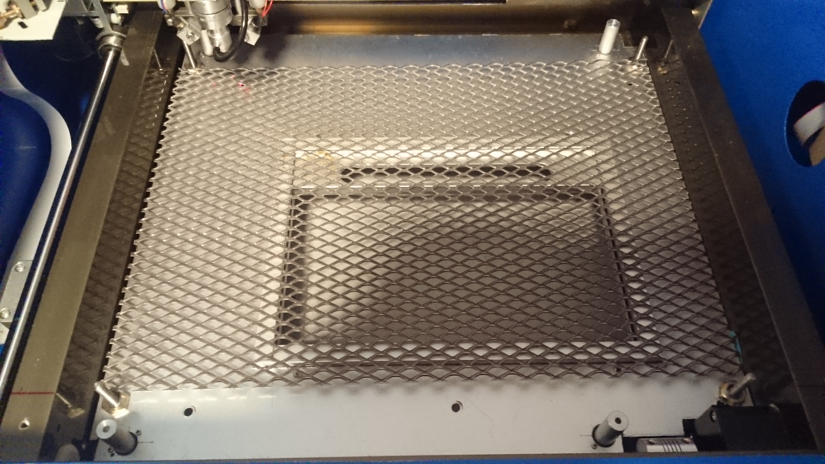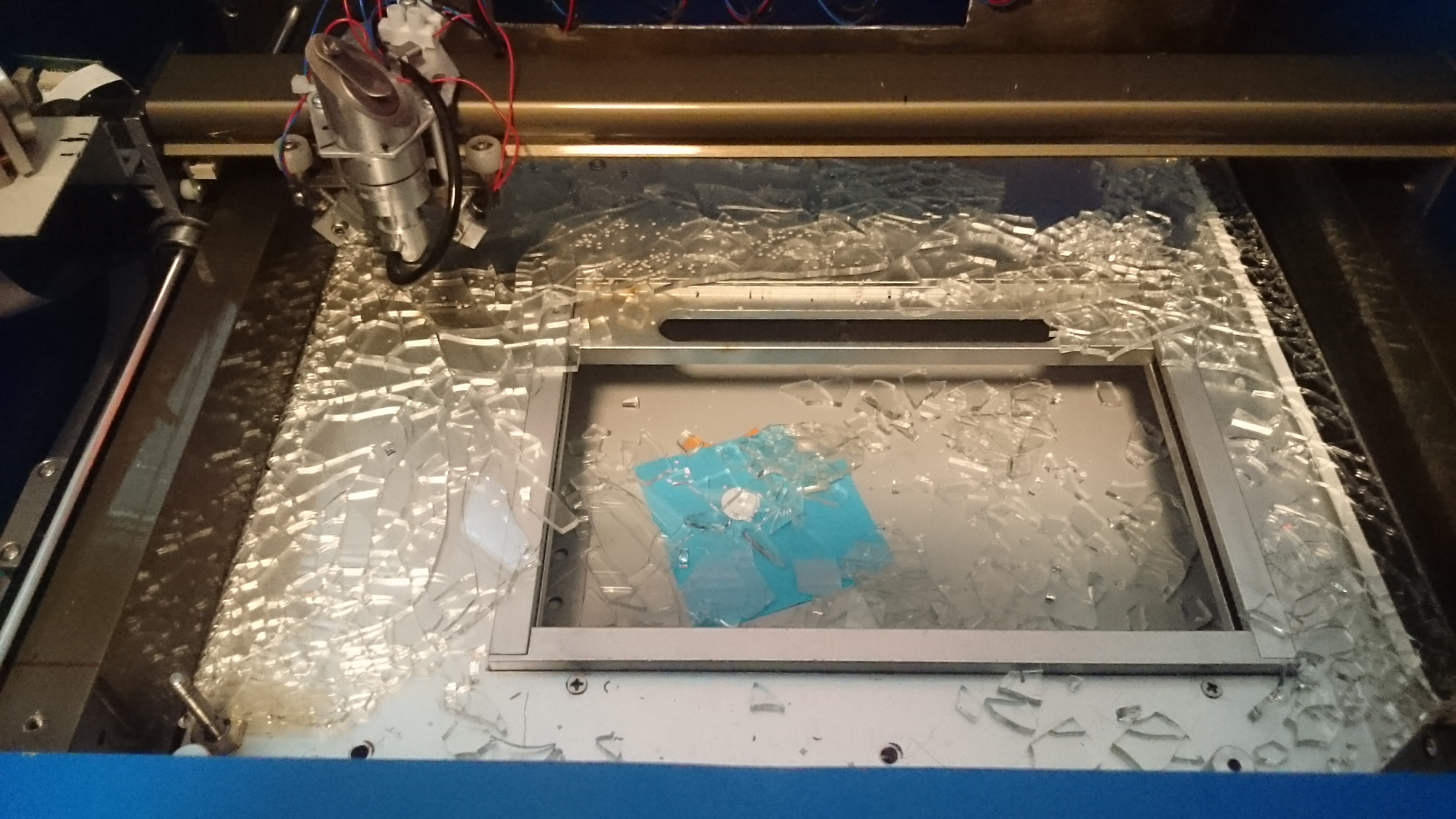 After some testcuts and some minutes later I heard some odd soundings coming from my cutter ant then: bang and splintering noises. I hurried up and disconnected all electricity, dismounted the dust fan, opened the rear because I was convinced that the lasertube was broken. But nothing to see, everythin seems to be OK, then I opended the front…