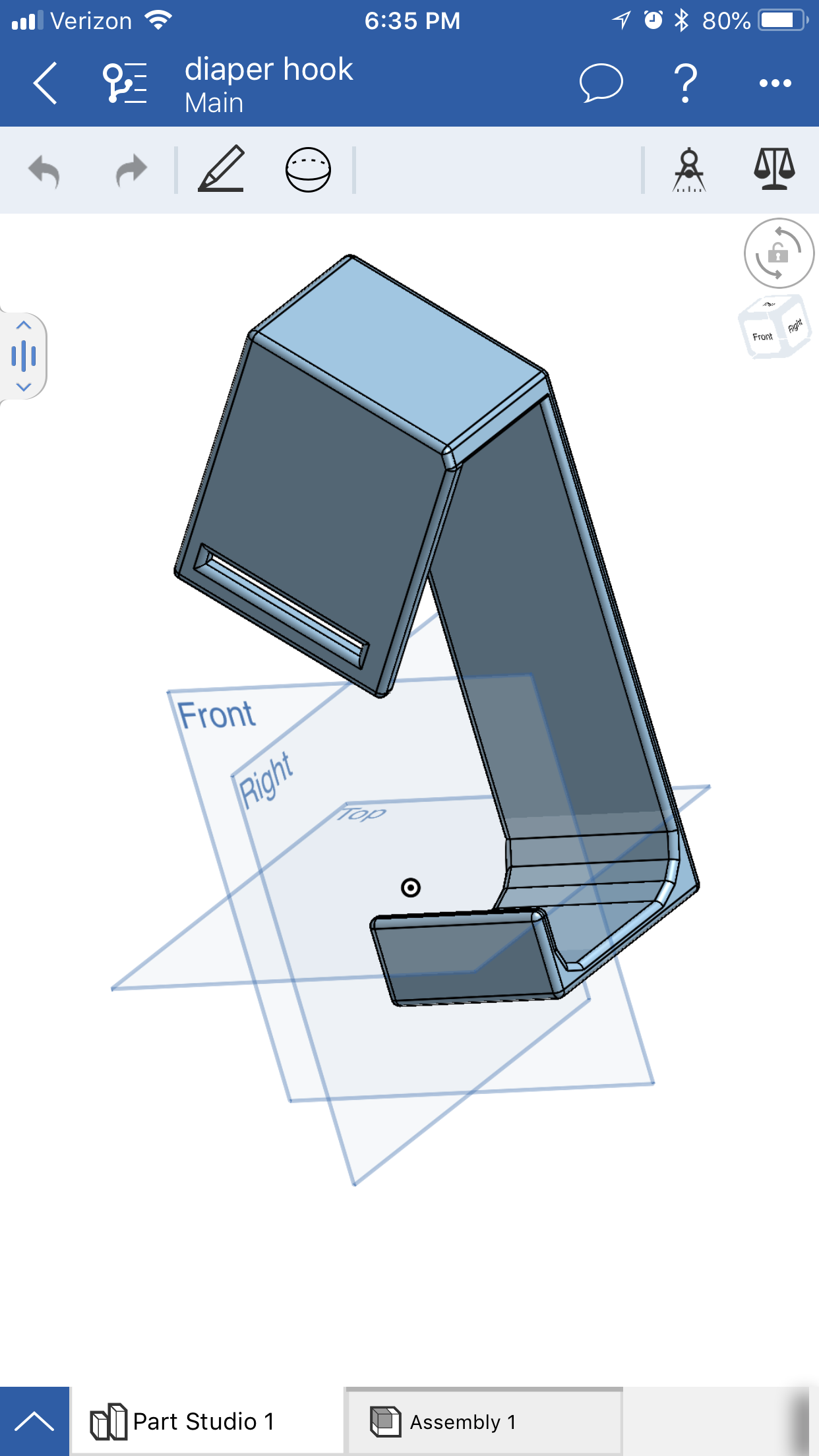 I wanted to make a hook for a bag to sit on a slanted railing. It took a few revisions, but I think it came out great! My Reliabuild3D RB2 printer did great with the 45 degree slope. The one pictured on the bed here was a previous build. I didn’t have to use supports for any of it.