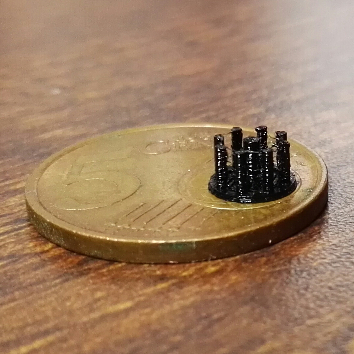 This part you can see does have bottom diameter of 6mm, 3.5mm height, and small piles are 0.75mm in diameter. This was first try to print parts this small, so I really didn’t tune it till the end and I was still very impressed to the result. It would be better with more cooling etc.