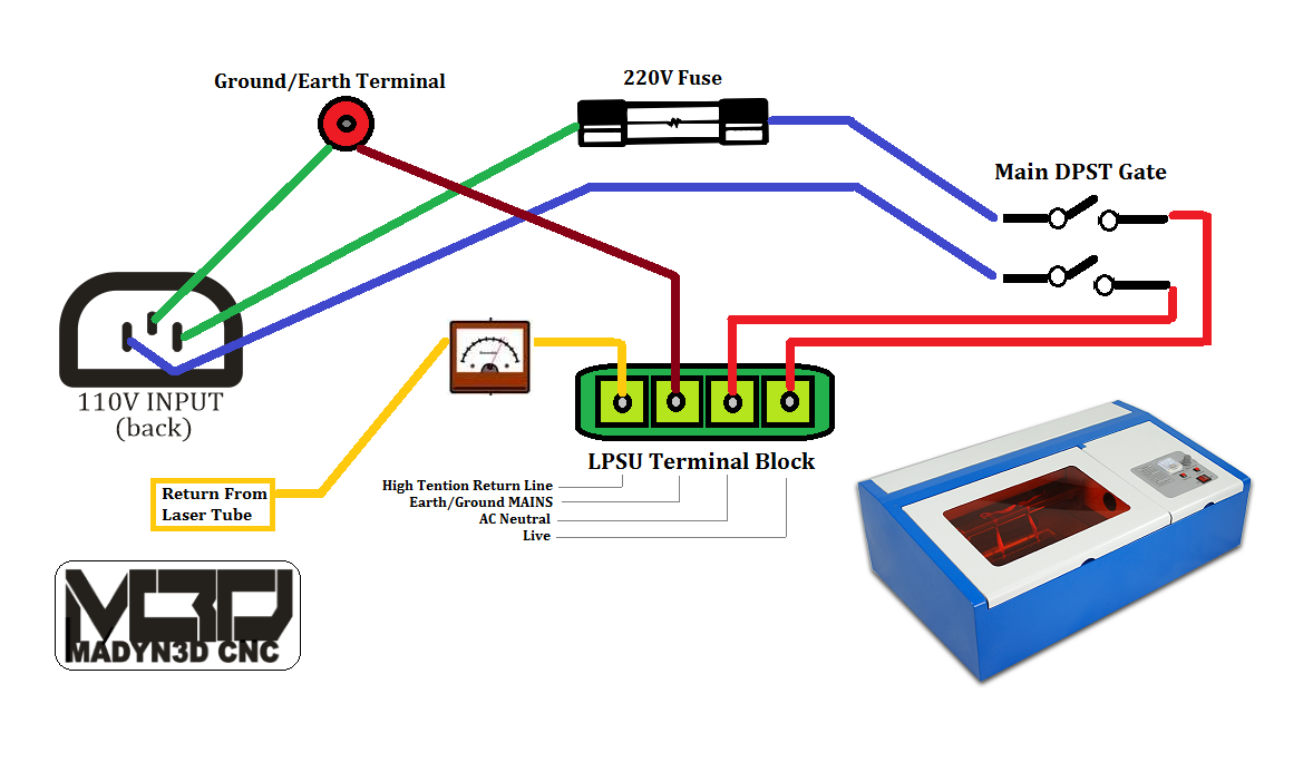 I was having a problem blowing my fuse after installing a new 220V/10A DPST switch on my control panel. I ended up having a faulty switch but it cost me a lot of aggravation coming to that conclusion. During the troubleshooting, I had to make myself a quick diagram for reference, because I learned my lesson a long time ago when it comes to trusting color codes and wiring standards from China. I went through checking continuity with the DMM while making this, just to be sure. I hope this helps someone in the future.