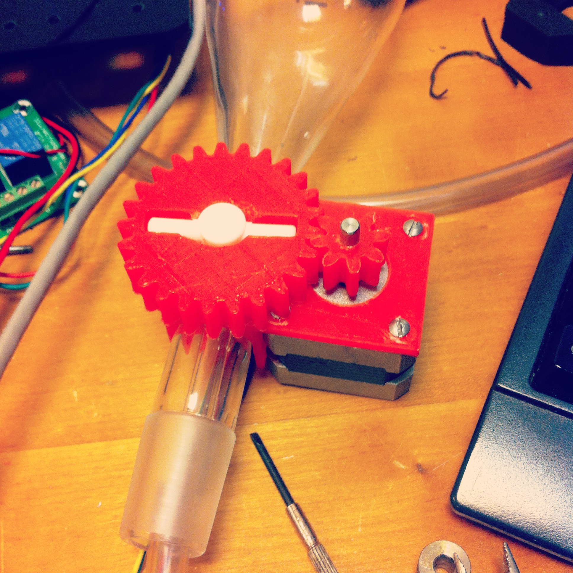 I was particularly happy with how this control for a separatory funnel turned out. The gears were made with involute gear plugin to Sketchup. The Small gear is stuck with friction, the large is held in place by the handle. The whole thing will be used in an automatic hand brew machine. I might add end stop for easy reset eventually.