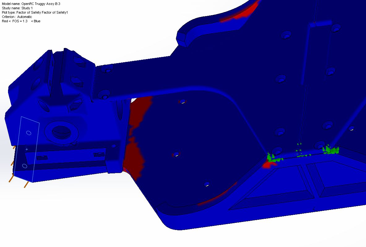 The blue and red plots are for factor of safety. The red areas are of concern, or where we will see failures. After seeing the areas of failure, I started tweaking the design to see if we could make this work with a fully printed part. I thickened up the base plate to 5mm and added several ribs. At this point we are still seeing a potential failure. I can’t spend any more time on this today, but suggest we look at extending the differential housings. I think if we extend those back onto the base plate, that will add some much needed strength in that area.