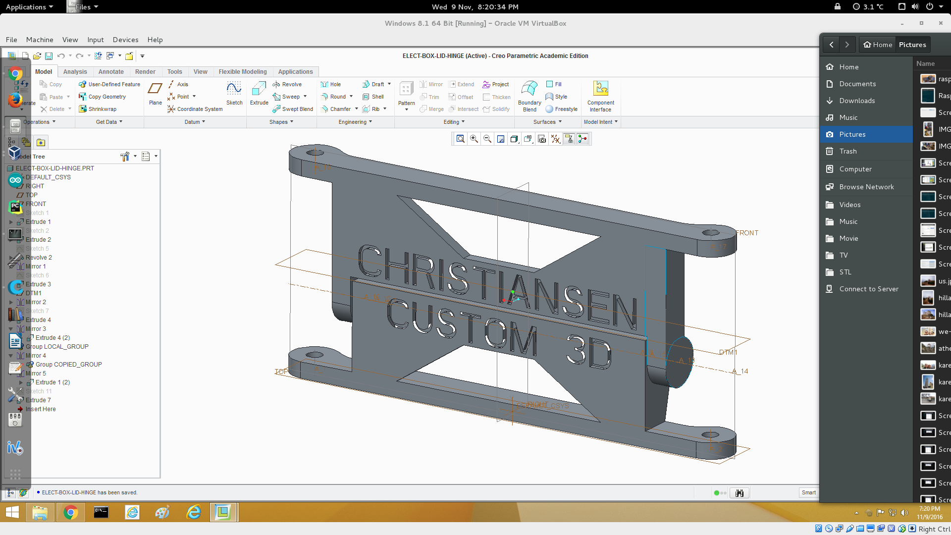 I wasn’t able to 3D print a working third appendage/arm to hold the lid while messing around with the Pi or Ramps, so I drew up a hinge for the lid instead. It’s two pieces but functions perfectly right off of the printer bed!