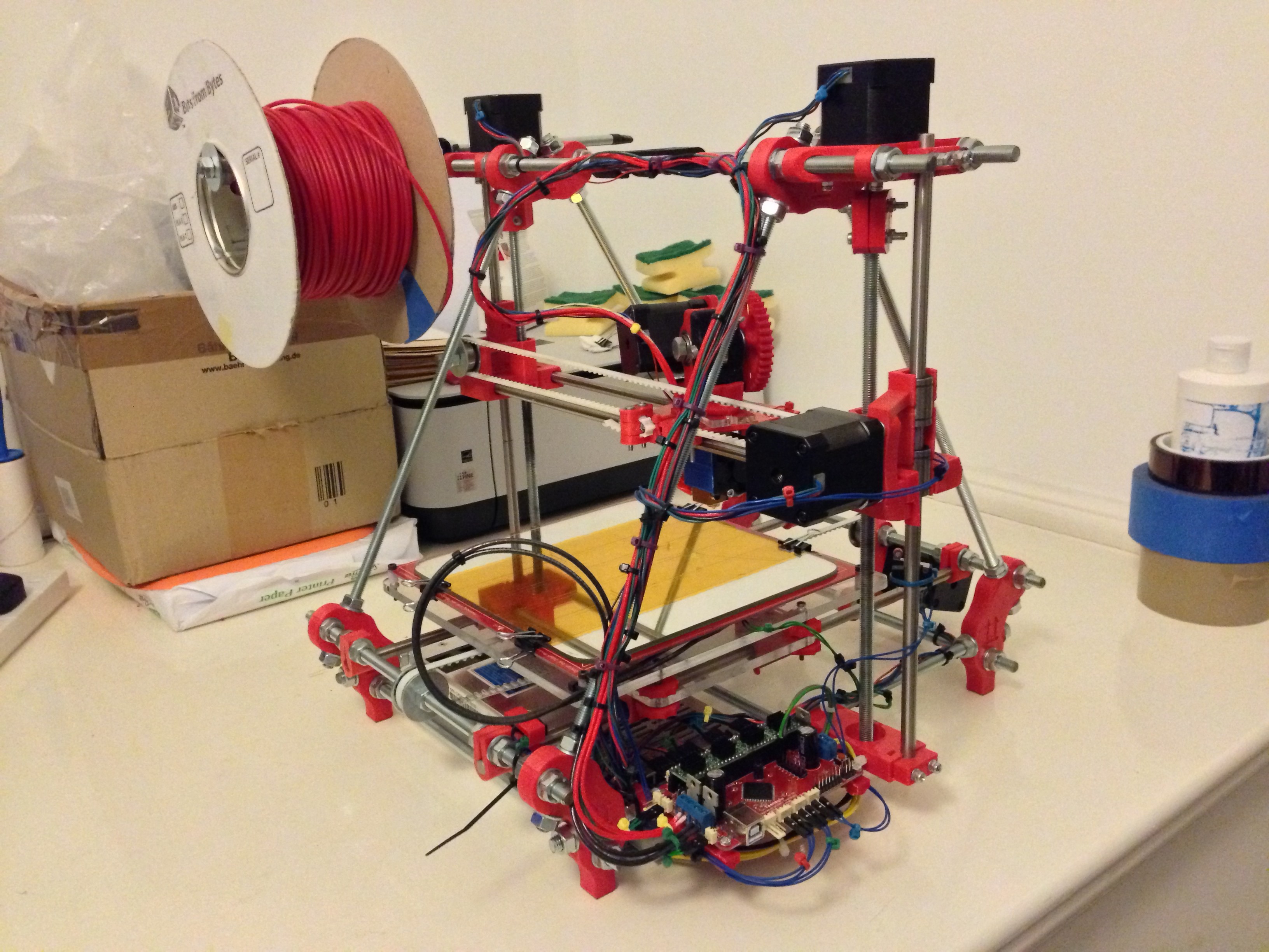 I’m just starting an i2 build, have 90% of the parts on hand now. Still need a HotEnd for Wade’s Extruder, and I’m waiting on the controller to arrive. Yours Looks awesome all in red. Mine will look like a dog’s breakfast. My local Public Library printed the parts for me in 4 different colours because I asked them to fit them into what ever print jobs had going and I did not care about the colour.