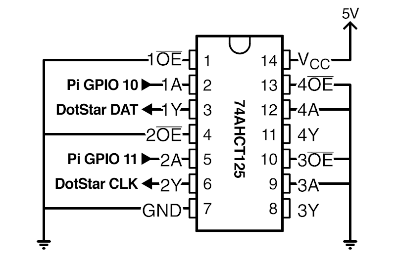 I would use a level shifter to change the voltage of the signals from 3.3v to 5v. In this design, I’m using data pins 7 and 11, and clock pins 13 and 14, and converting them to 5v using the level shifter.