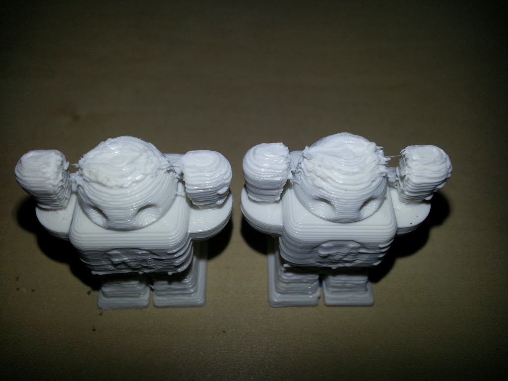 ok, I had a chance to print another robot. I dropped the temp another 2C and slowed everything except the infill and printed it with octoprint. the two octoprint robots look identical, all the artifacts are in exactly the same place but they appear to be more pronounced in the last print. I can’t find a setting in slic3r to slow just small layers and cura is giving me a hard time on 64bit linux but I’m going to keep working on that