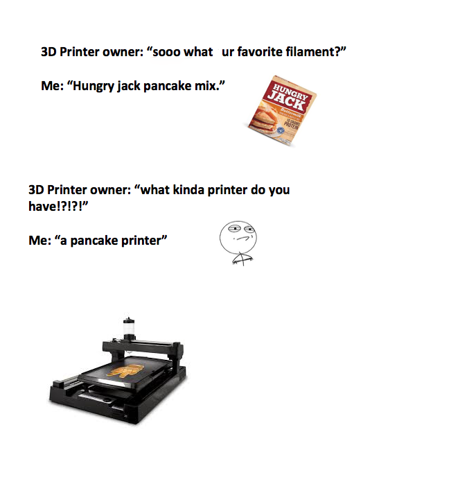 Cool as the pancake bot is, it is not a â3Dâ printer when it only prints in a single layer and does not have a 3rd dimension. Really annoys me when people refer to anything cnc controlled these days as a â3d printerâ of some sort. Same with the Glowforge being refered to as a â3d laser printerâ