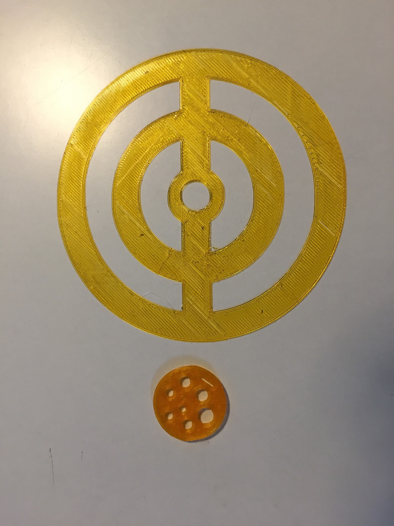 I’m currently facing a weird printing quality issue that i can’t seem to wrap my head around. Printer is an off-the-shelf OrdBOT from RepRapDiscount which printed quite well so far though i haven’t had an eye on high quality during the last months. In the build process of my new Eusthatios now i saw that smaller holes/rounds up to around 20-25mm in diameter show weird deformings. See the picture to get an impression. This is a test part with 25mm diameter and different sized holes. You should see that the circles and holes aren’t really round but have quite a few flat parts - especially a bigger one that seems to happen in the same place over and over again. Good news is that this error doesn’t scale. It only matters on diameters up to max 30mm - on bigger roundings and circles this doesn’t look so bad (see other pic)