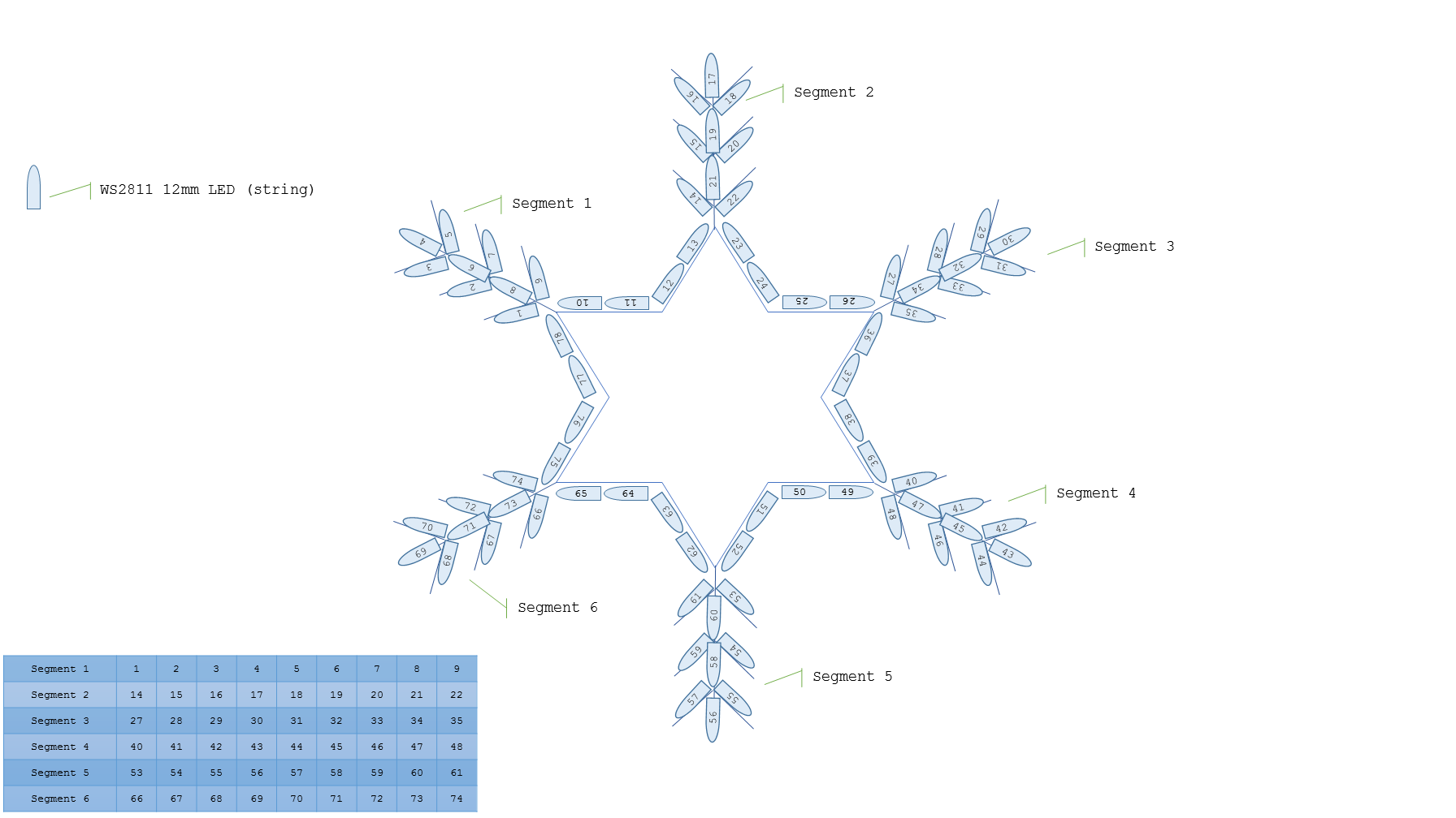 I know which LEDs are in a segment, so i began by putting the LEDs into arrays.