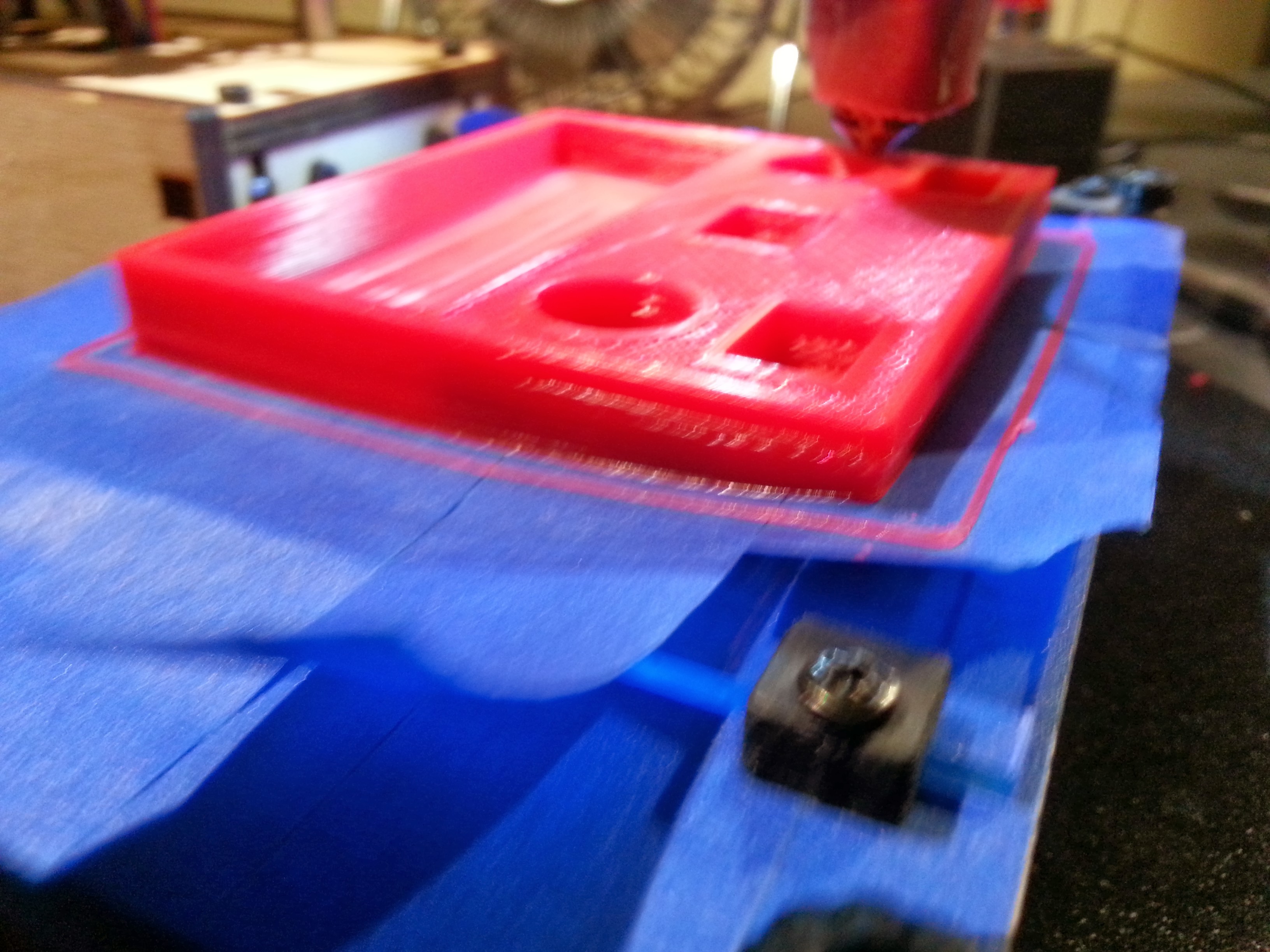 I tried printing in Coex red PLA, 210C, 0.3mm layers, 50% infill, fan on, and got terrible curling at the corners, pulling up the blue tape.