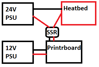 I have a 12V PSU and relay that ran it I just want to eliminate the 25m heatup times. The first time the relay triggers its heated up in 5m this way. Eventually I am going to eliminate the 12V PSU (Its just a crappy PC PSU). I have a DC/DC converter to step the 24V down to 12V that will provide the board power. But thats for when I convert to my azteeg x3 pro with my Kraken hotend and 4 extruders. I also have a small laser cutter that I would be adding… But I am not trying to add a bunch of variables at once…