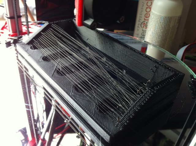 I’m printing the first “Thing” I’ve designed in FreeCad. I need to play with retraction settings more but one of the first lessons learnt was lay out Construction Lines that replicate the build surface, that way you know it’s going to fit. Attempt one was too long and had a corner just slipping off the Kossel Mini mirror bed.