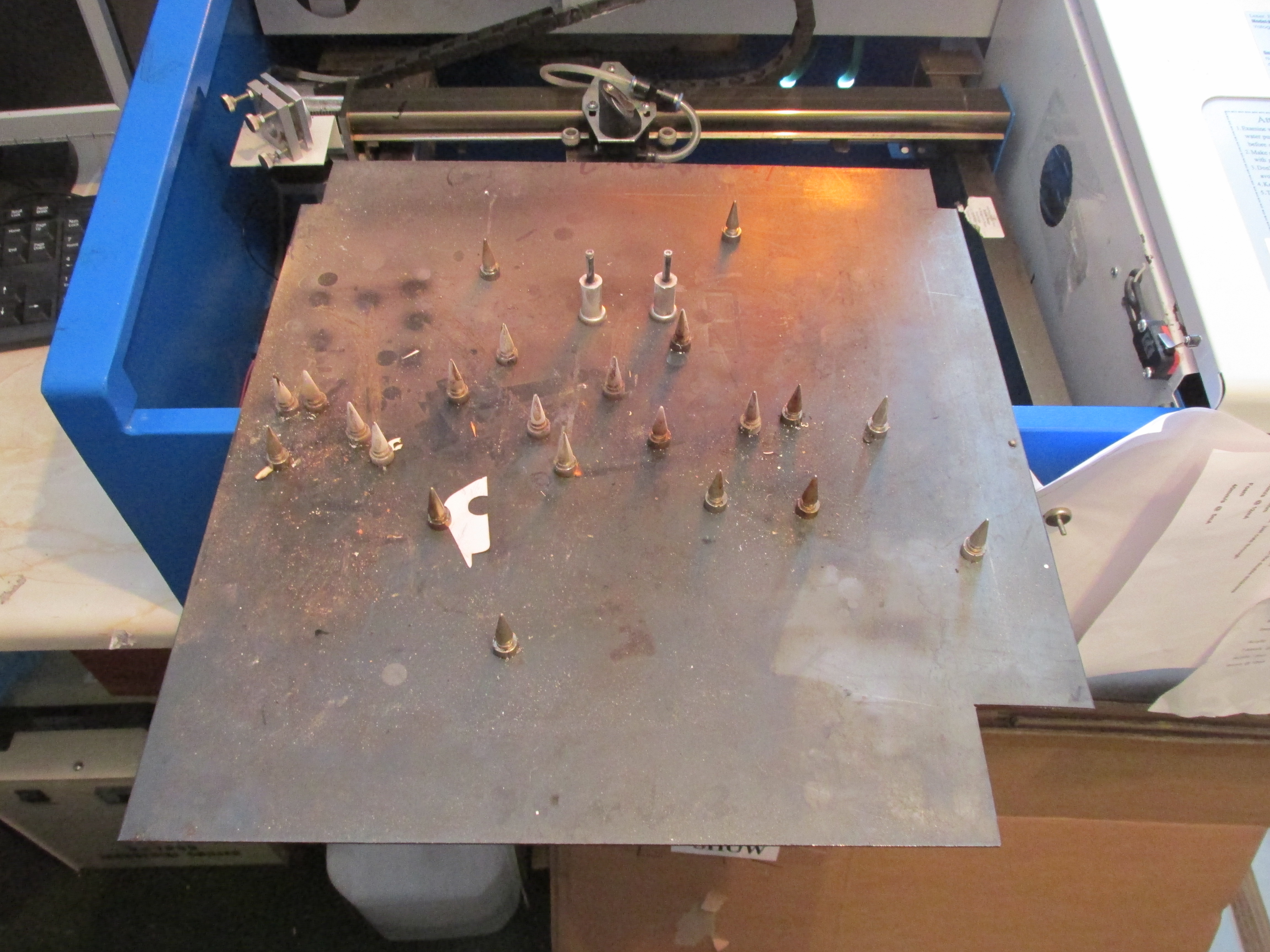 The two oddly shaped posts (also on magnets) are used as a registration for example when engraving both sides of something or when cutting something too big to cut in one go.