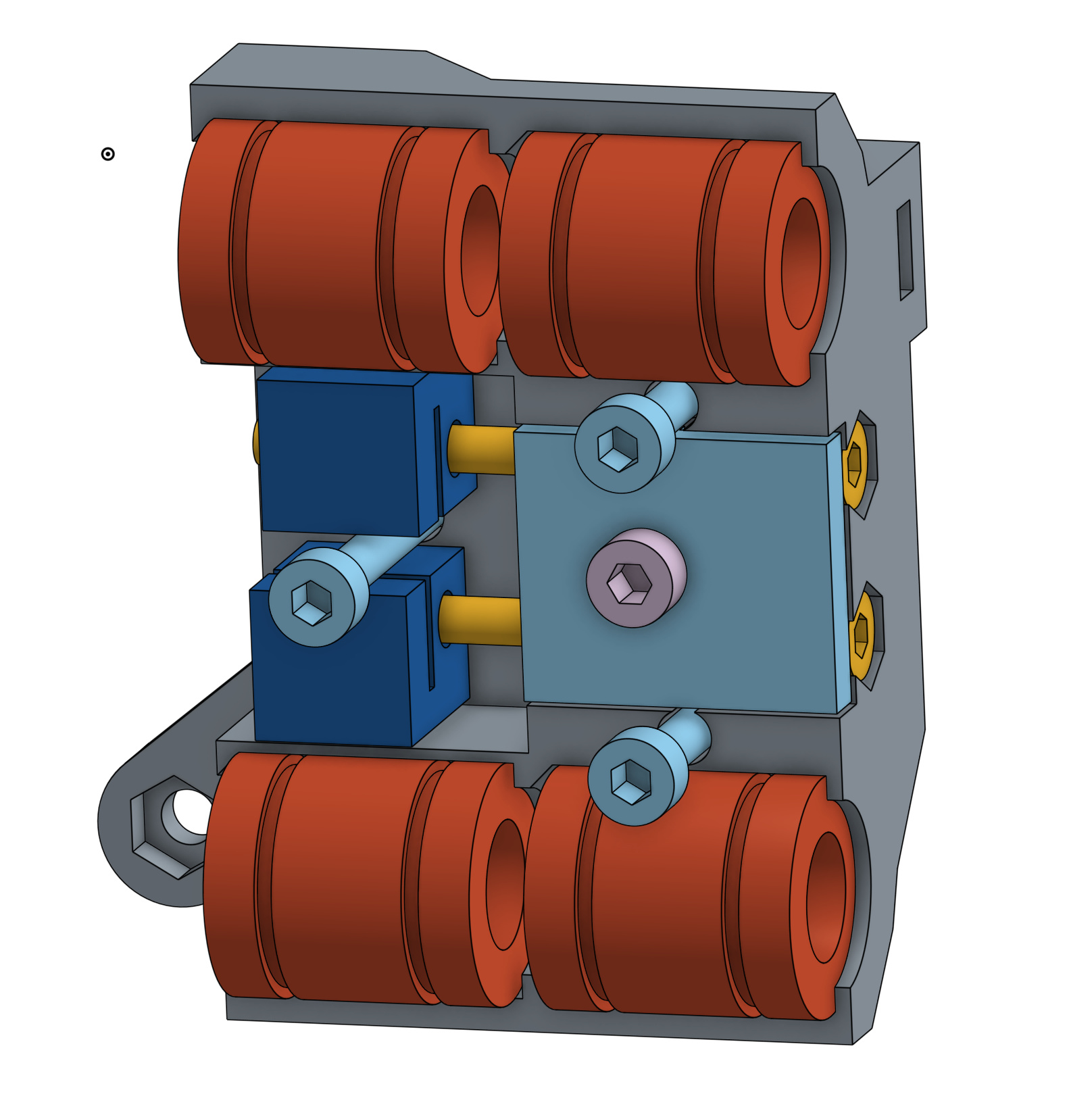 The light blue screw heads sticking out front hold down the front half of the x carriage which mounts the direct drive extruder and hotend. Having this be 2 pieces means I can replace the entire extruder and x carriage without taking the x ends off which would require pretty much taking the entire moving XY structure out of the printer…