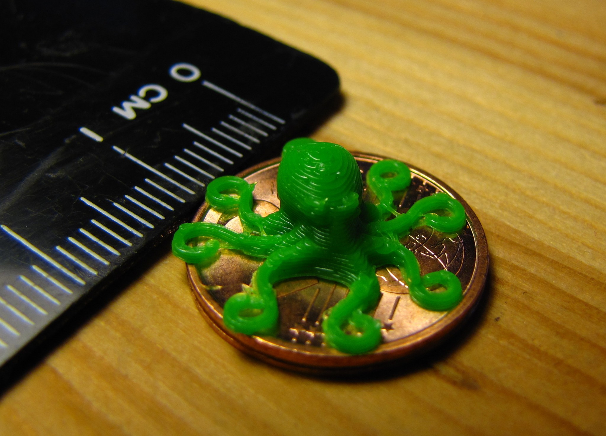 Inspired by http://3dprintingindustry.com/2013/02/08/reprap-forums-3d-print-something-tiny-challenge/, I wanted to see how small my Huxley can go. This is http://www.thingiverse.com/thing:8896 downscaled in Slic3r to 20% using a 0.2mm layer height. Sitting on a e Euro-Cent coin (1.9cm across).