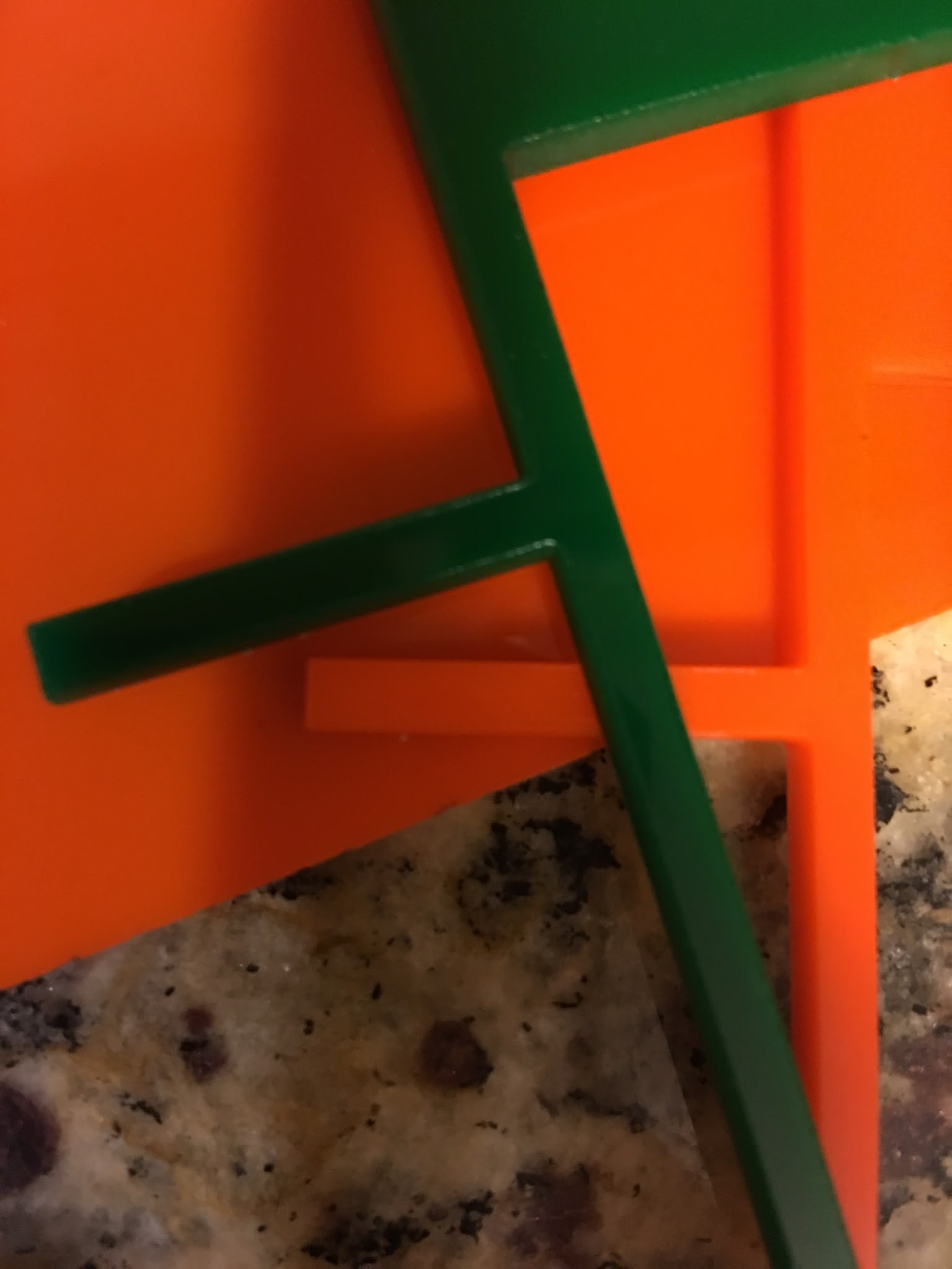 I did also notice that the extrusion direction can make a difference when trying to bend the extruded acrylic, so it’s possible that the direction of the extrusion may also make a difference on the cuts. Do you notice whether the horizontal & vertical cuts are similar in result on your green piece? Or is one direction “cleaner” than the other?