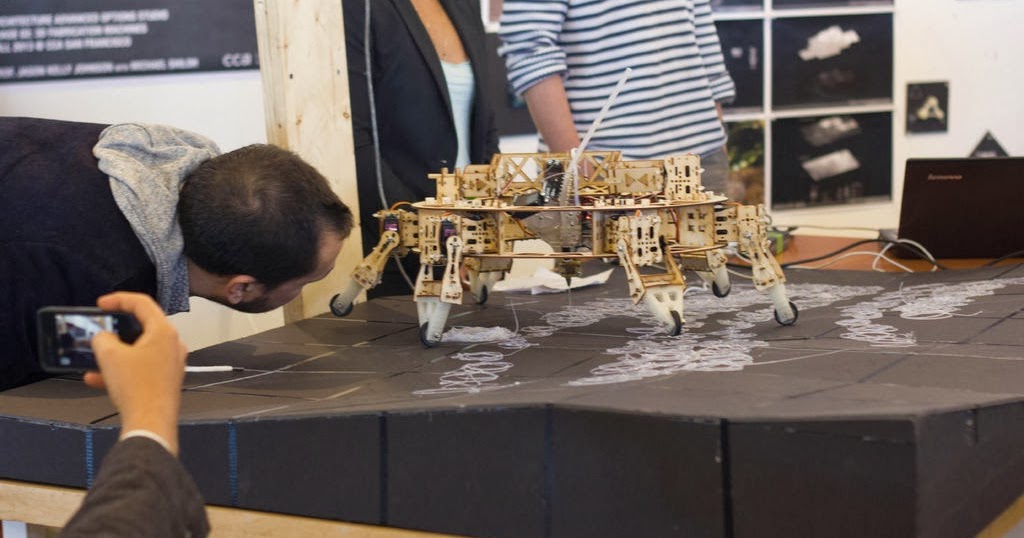 It is a walking hexabot 3d printer that prints on the surface on which it walks.