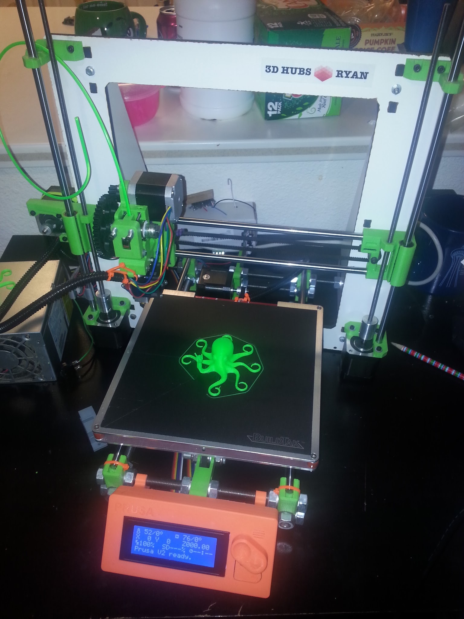 Other than that though the very first print came out pretty dang nice as you can see from my friend rocking out in the pics. I made a couple custom x and y endstop holders since I didn’t like what was out there I’ll toss up on thingiverse and youmagine later. The power supply is only 300 watt so the bed takes a bit to heat up but that could also be due to it not being in an enclosure yet. The belts had to be tightened up a bit after the first run and it’s all ready to start paying itself back.