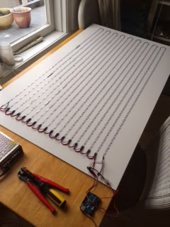 It’s alive! Got first light on my 32 x 18 pixel array. Only casualty being pin 4 on the poor Uno, which was being requested to supply current for one whole strip as I forgot to wire that one to the power bus.