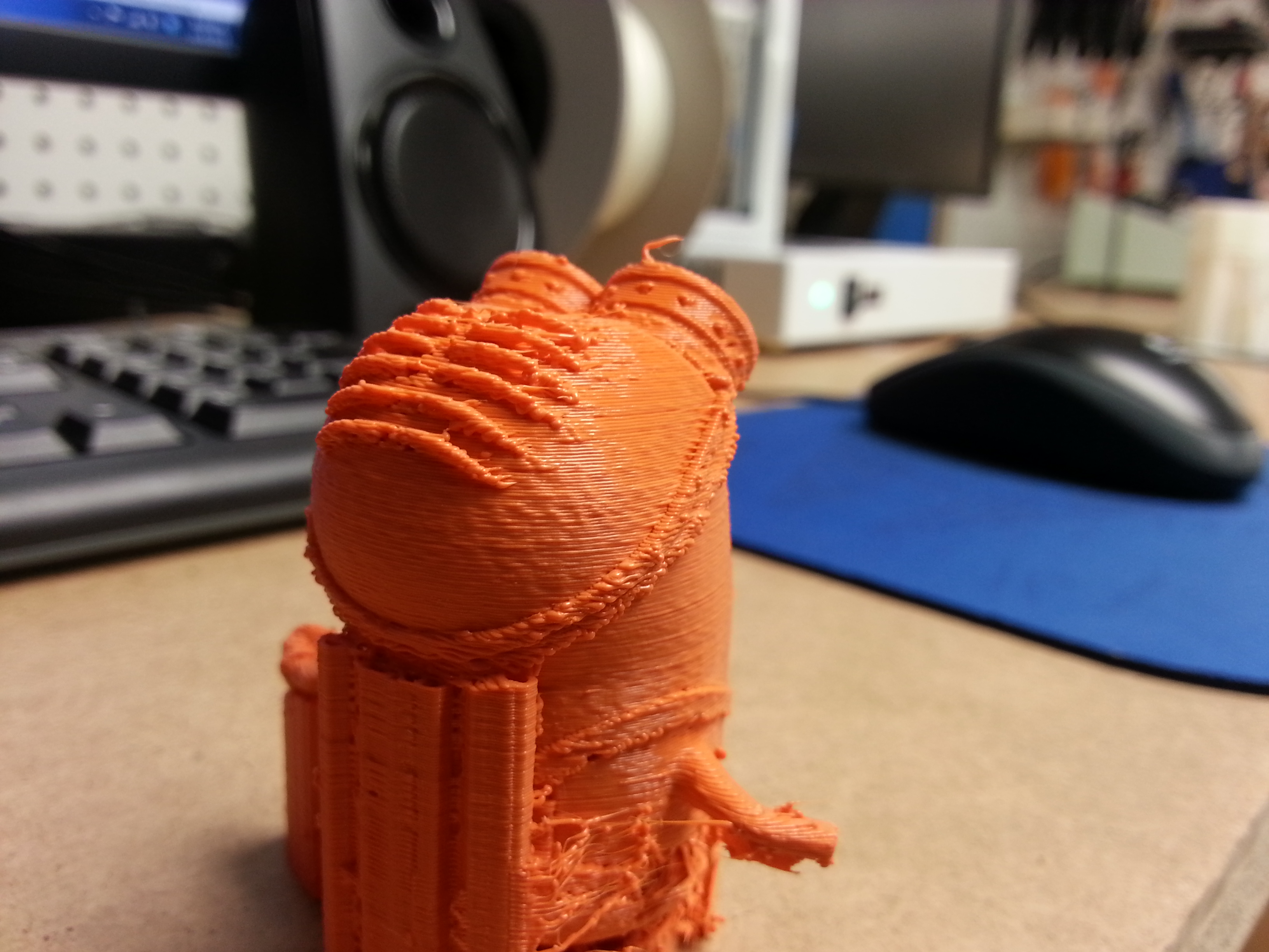 This was done on a Lulzbot TAZ. I’ve been struggling to get good prints off of it for months. I thought it was the bushings that they used instead of linear bearings. Replaced them with the linear bearings. I thought maybe my belts weren’t tight enough. They’re nice and tight now. I’m just at the end of my rope with this. I also have an Up Plus 2 printer (you can see it in the background) and it works marvelously. It’s nearly a set and forget machine. I with I had two of them instead of the TAZ.