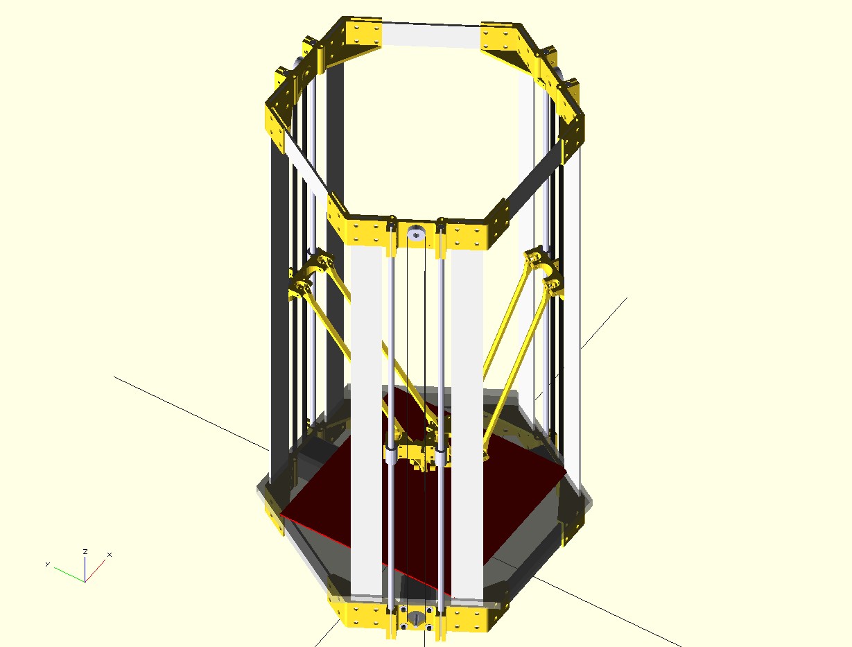 I’ve been looking a the delta designs (rostock, kossel, cerberus, etc.) and love the concept for the simplicity, reduced part count, and aesthetics. I like the design of the kossel (using aluminum extrusion) framing but am concerned with the wear of running a on the extrusion (which is not designed for such use). On to of that, extrusions can be a pain to source locally. I’m leaning toward the original rod/linear bearing carriage design, but find the structure of the rostock (needing the large brace for structural stability and torsional stiffness) is not that elegant. I’ve been brainstorming some alternatives that use rods for the carriage, but don’t rely on the rods for structure, and have come up with this variant I’ve tentatively called “flatstock” giving a nod to the rostock parentage, that used flat barstock aluminum (1.5" x 1/8") that is readily available locally.My thinking is that the pairs of flatstock bolted into the printed frame should give the rigidity I’ve been looking for.