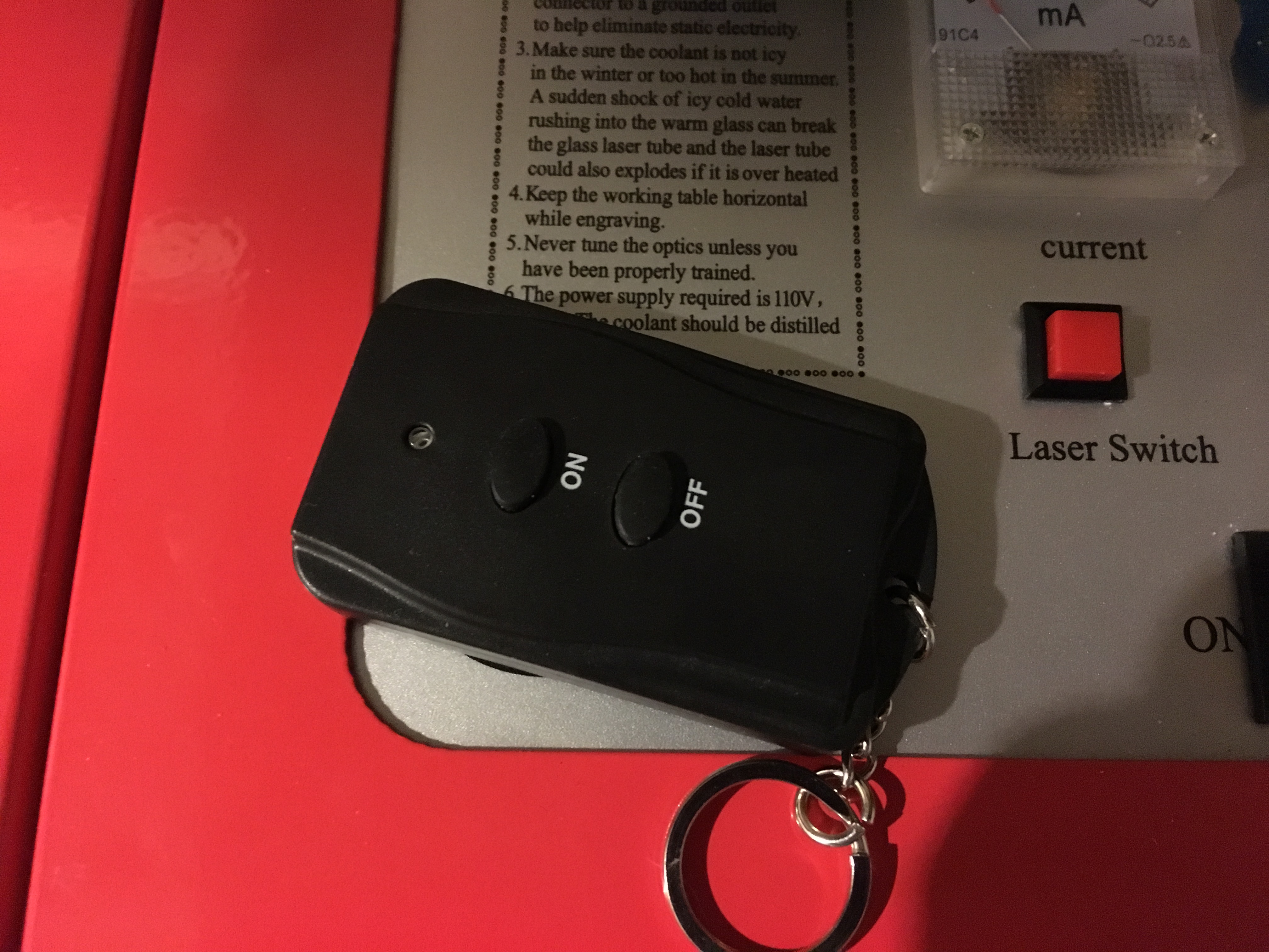 It’s a remote on/off switch used for Halloween or Christmas lights. I have my water pump, exhaust fan, and K40 plugged up through a surge protector to it. Easy way to make sure everything is on at the same time. Plus taking the remote away makes it a little harder for someone else to turn on my machine (kids).