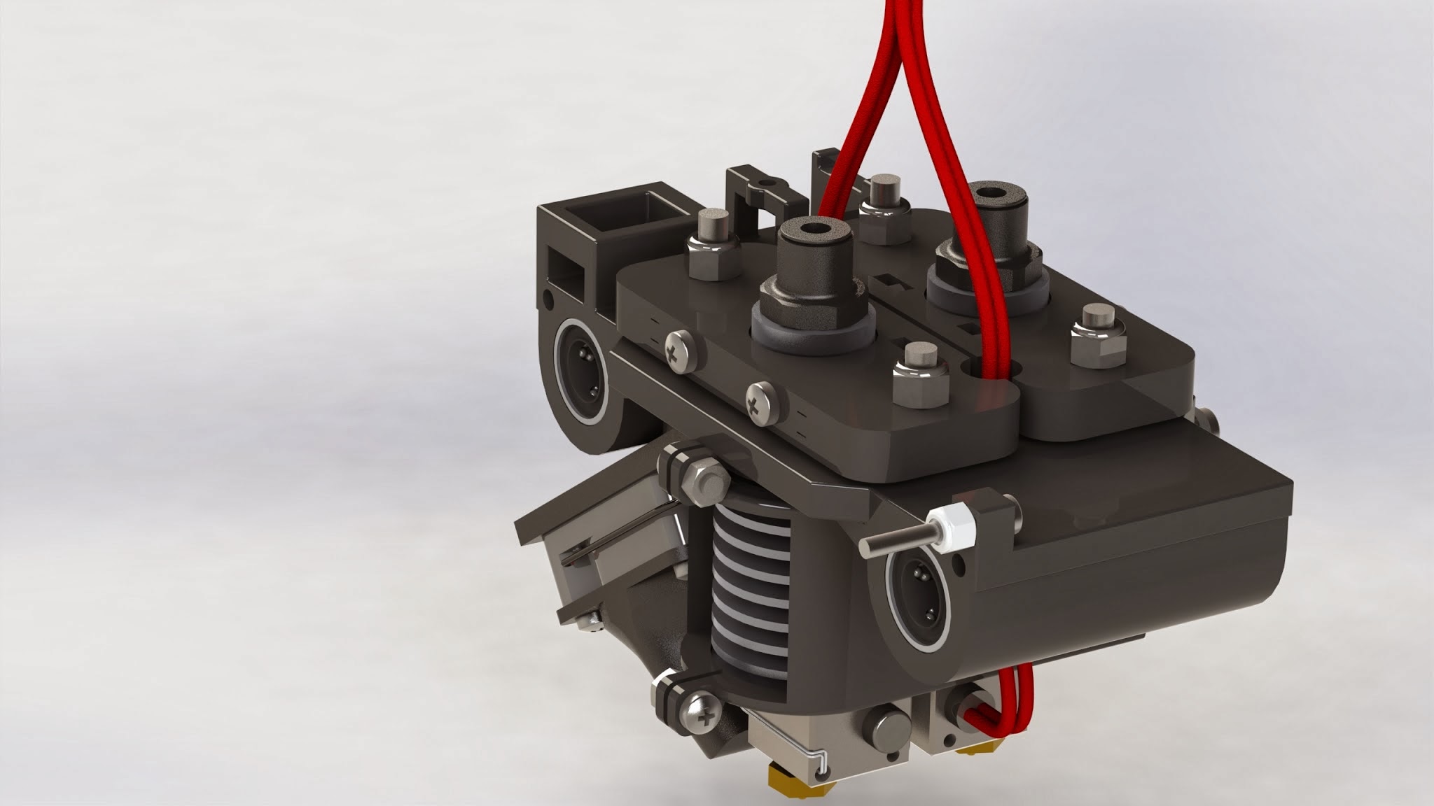 It’s a fairly basic and contained design. The E3D nozzles mount to a plate with a V saddle insert. This secures the heat sink extremely well, requiring a large amount of force to twist slightly. The mounting plate then connects to the carriage via a screw acting as a post. This is them able to be adjusted height wise to calibrate the nozzle heights, with a spring providing resistance.