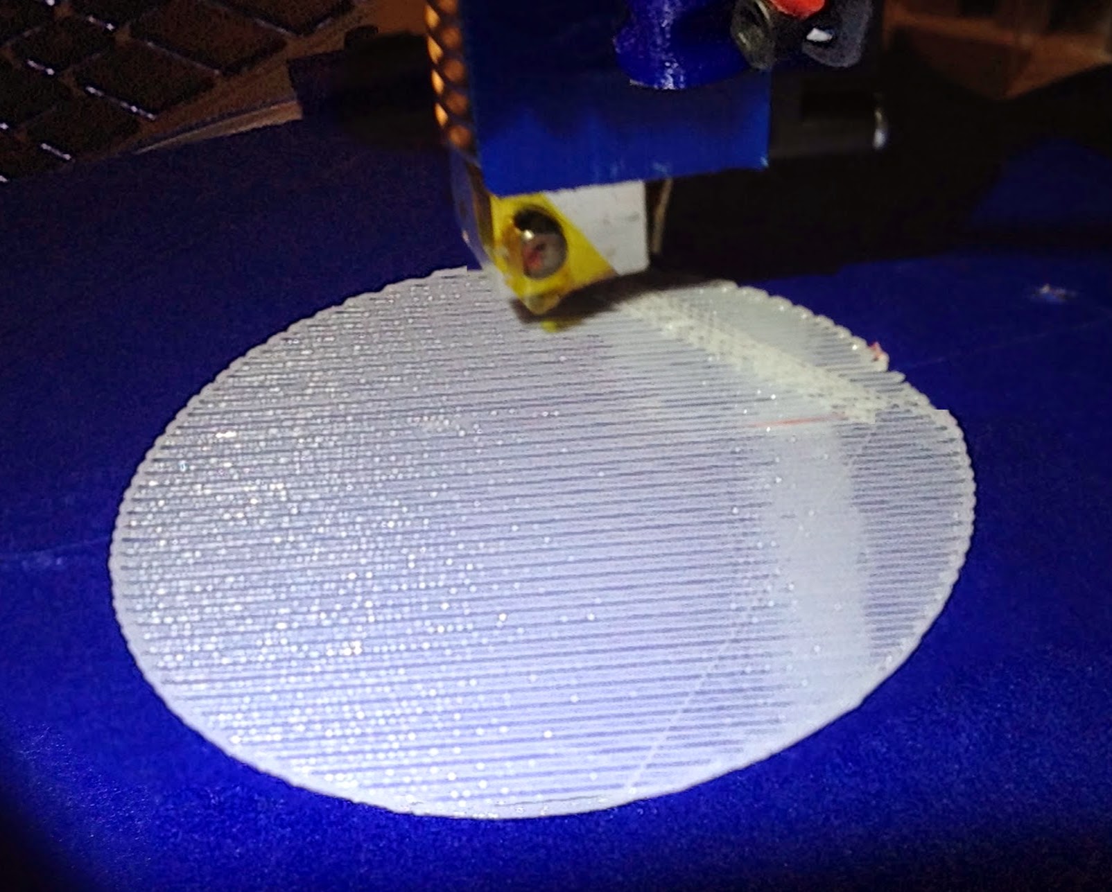 I’ve noticed an interesting pattern in the raft of my prints on my new printer, which you can see on the right side of the raft in this picture. (Ignore the stuff on the upper right, that’s just the next layer of the raft)