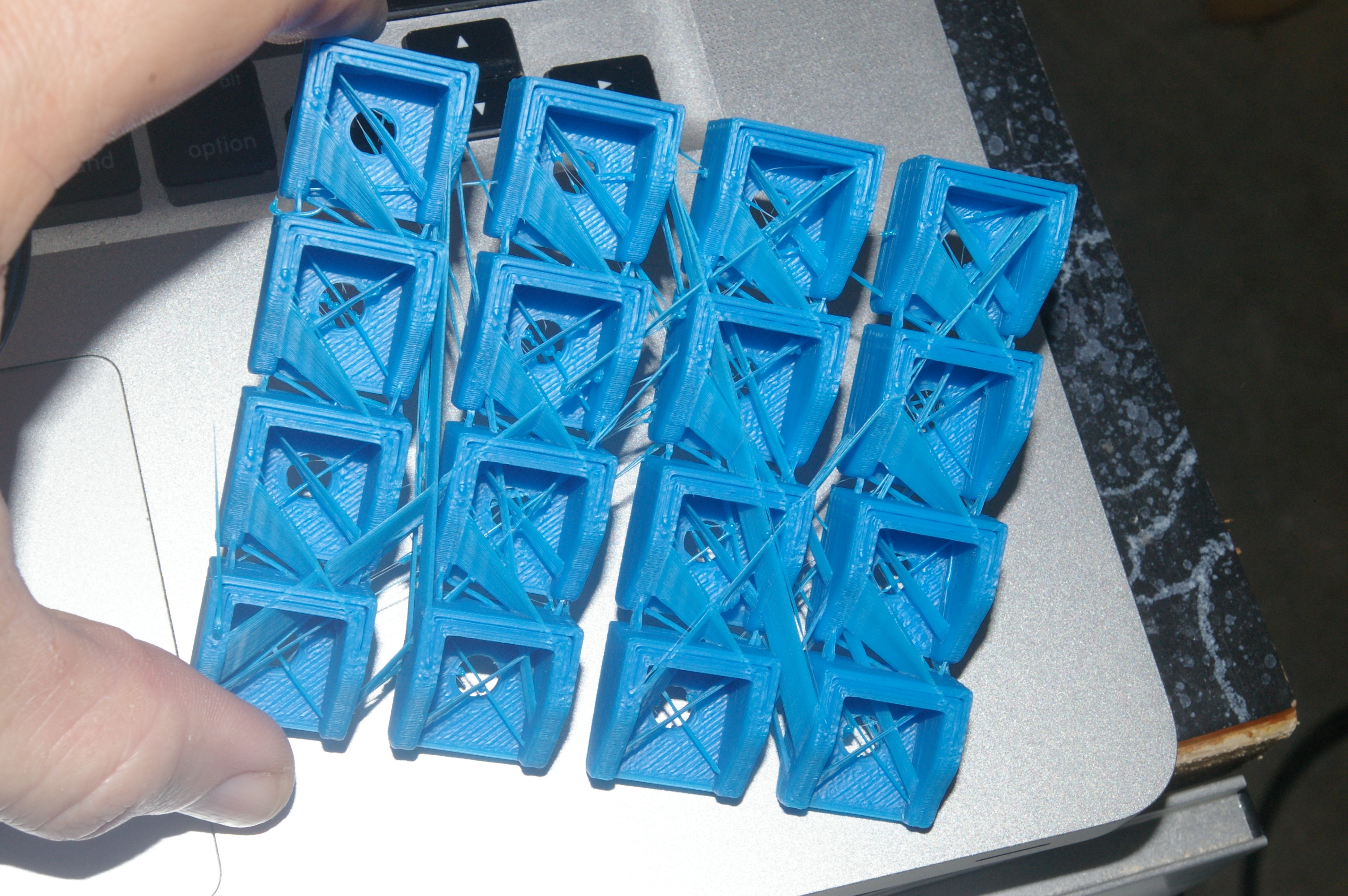 ) But these two negatives turned into a positive. Because the bed wasn’t quite trammed the back right corner was lower, so the first layer eventually came unstuck from the bed. It flopped around for a few layers but eventually the strings bonded it to the rest of the print. That part is no good (warped) but I managed to save the rest of the plate. Success!(?)