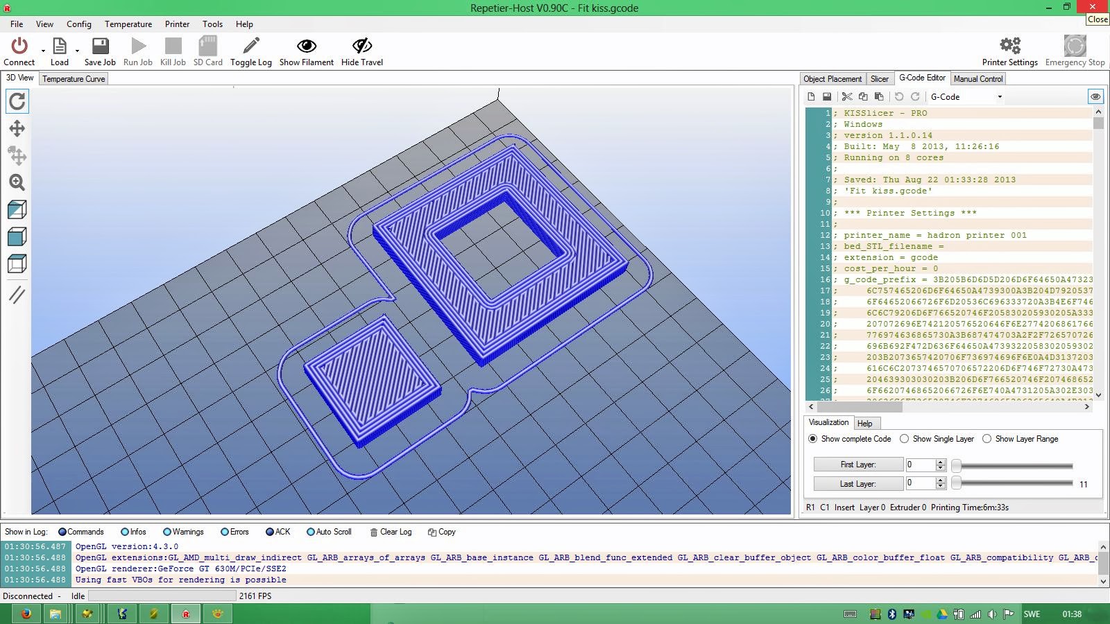 It great for dialing in your retraction and prime settings, as well as cooling settings due to the overhangs. As I mentioned above, as long as you don’t change anything that requires Kiss to re-slice and you are using Repetier host, you can make changes on the fly during a print by pasting the new Kiss Gcode into the the GCode window in Repetier. You can just do a full replace as it doesn’t care about code it’s already processed. What this allow you to do is tweek things like retract and prime during a single print rather than restarting from scratch each time you make a settings change. Of course this only works if the paths and layers are all the same - you can’t change layer height etc without some probably messy results.