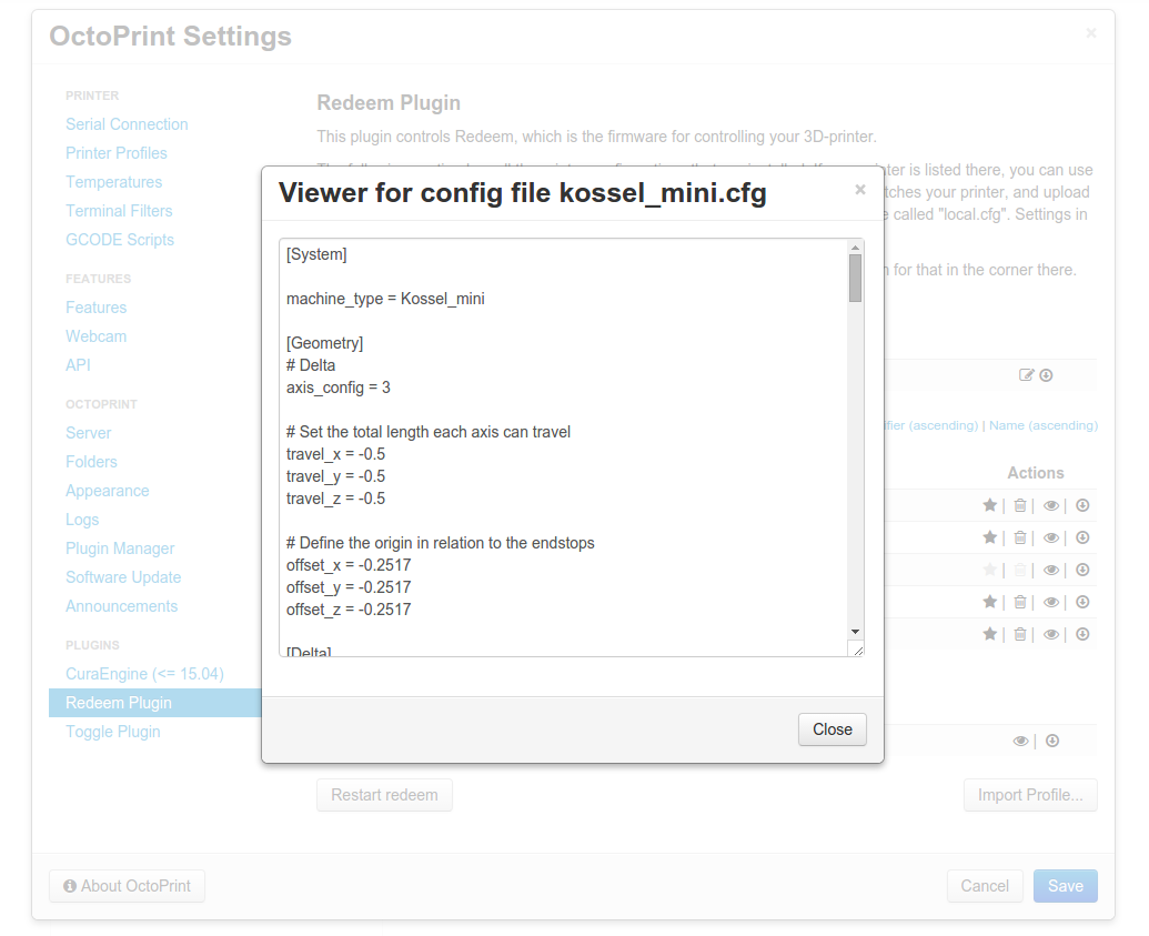 I’ve recently update the OctoPrint Redeem plugin, so people can now see the contents of the printer config files as well as default.cfg. Especially for Windows users this is welcome, since the newline is different!