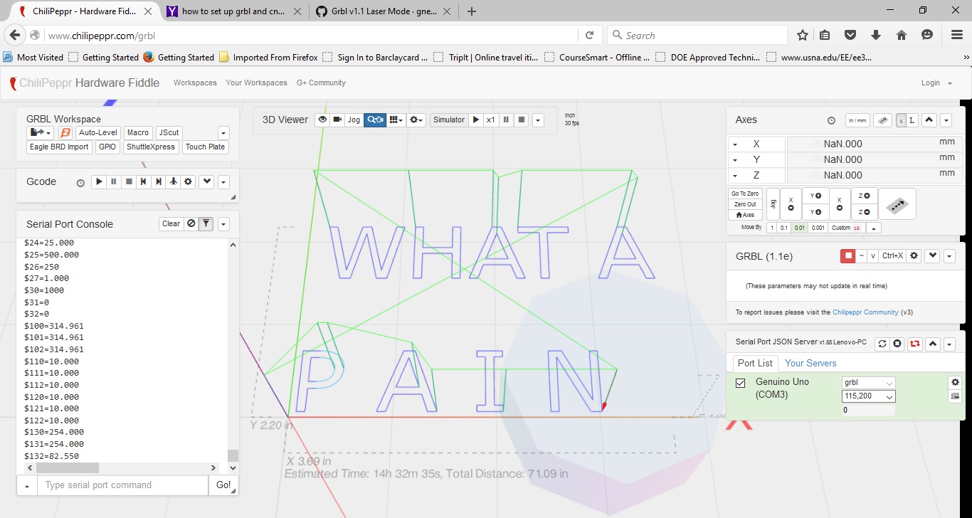 I’ve tried reading some other instances of folks receiving Not a Number(NAN) in their GRBL workspace. I’ve tried re-flashing the version of Grbl (1.1) as well as trying in multiple browers. When I change the port server to “default” I don’t get NaN but I also do not get any coordinate tracking. I’ve tried turning on and off the filter as well and do not have any success. I would appreciate any help on how to get my coordinates to work, or what I did wrong in the setup to fix it.