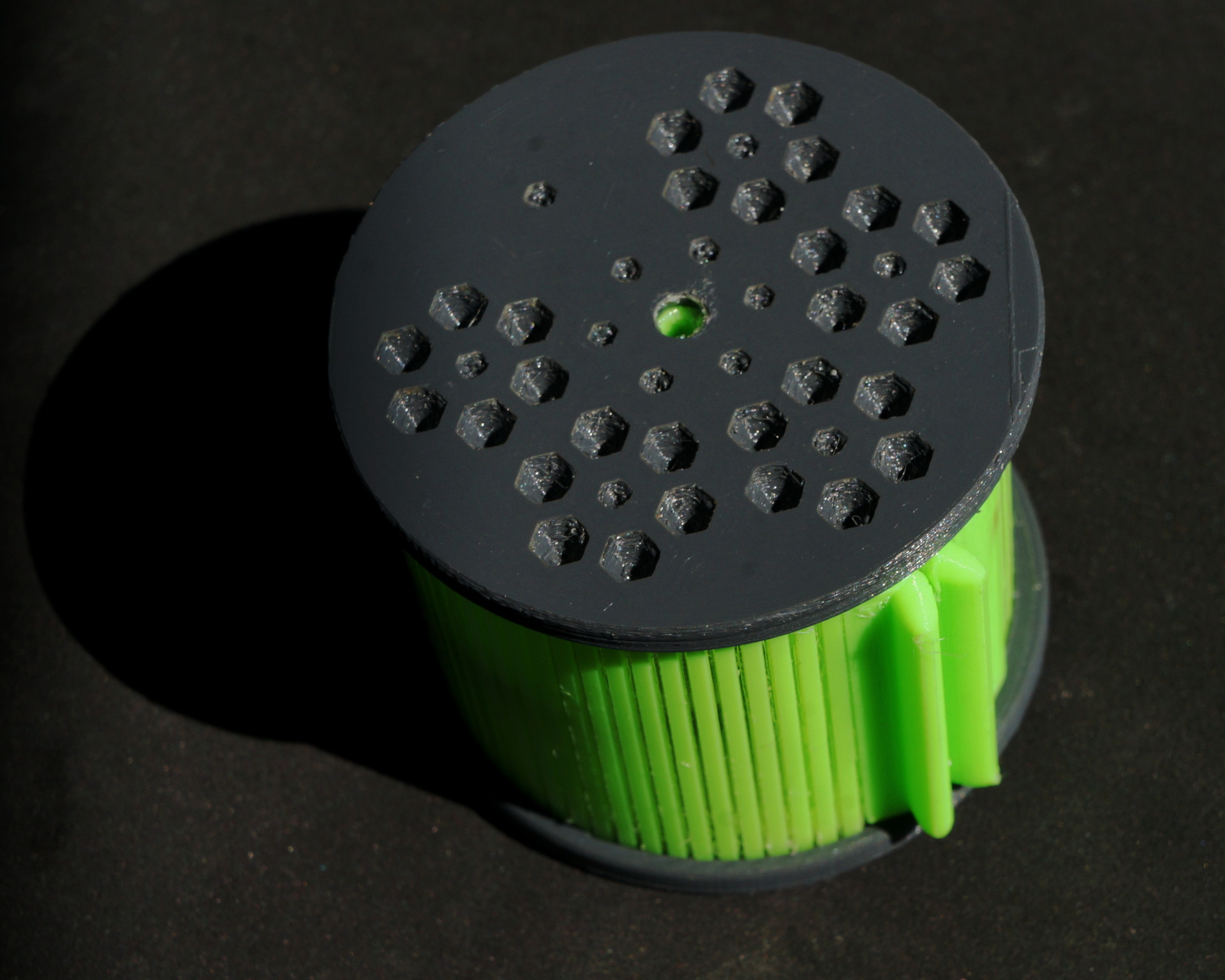 The roller consist of a thin TPU (transparent) backing and PET-G slats (neon).