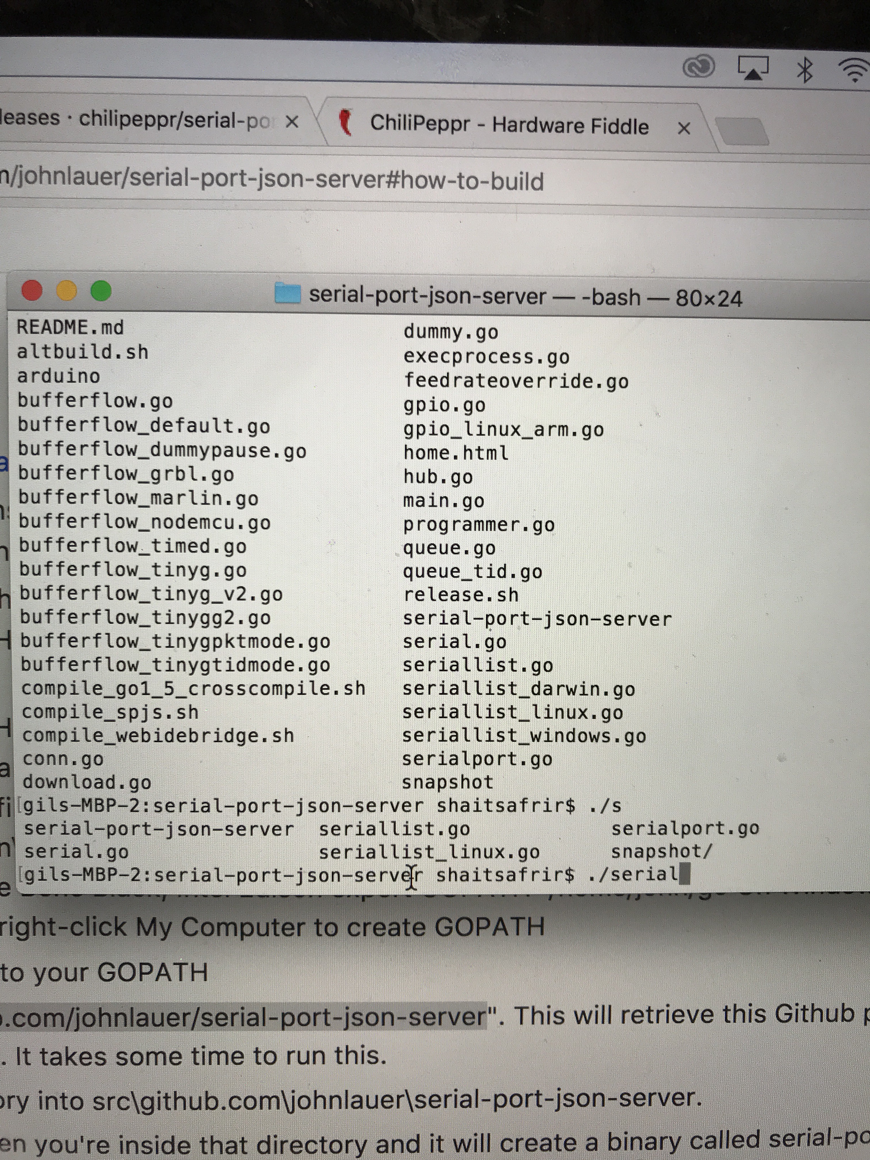 This video around the 18 minute mark shows how he setup serial port json server and chilipeppr. Maybe that helps. https://www.youtube.com/watch?v=Cf6-82r46ds