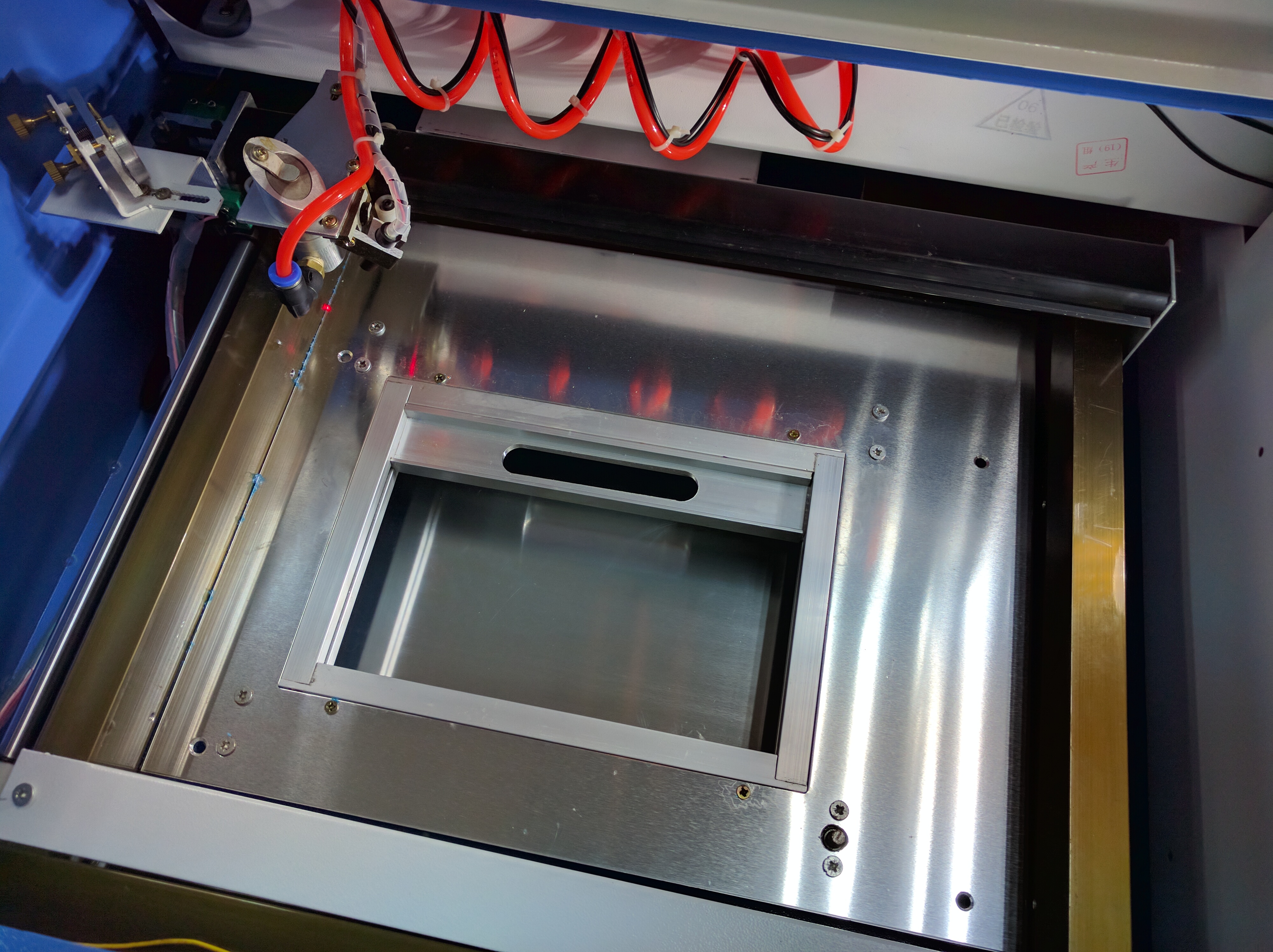This K40 is a little “special” - besides the air assist, red laser tracking, it comes with and a manually adjustable Z axis bed out of the box. a little stiff though, it’s a screw drive that is “belt driven” on all four corners.