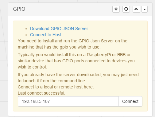 Basically this is a simple Go based GPIO server. You install it the same as you do for the Serial Port JSON Server, and then connect to it using the GPIO widget I’ve thrown together (link below).